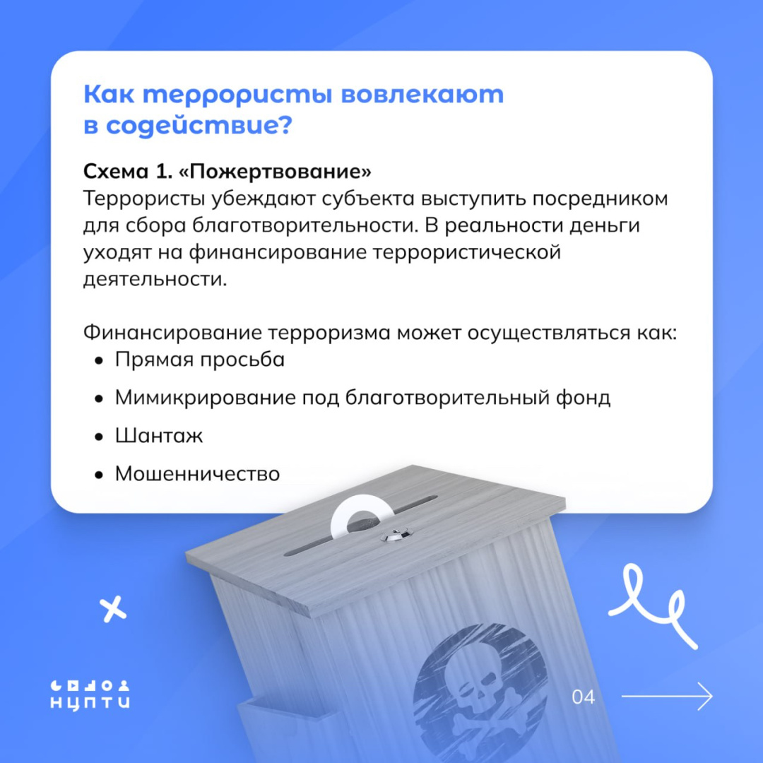 В рамках исполнения Комплексного плана противодействия идеологии терроризма в Российской Федерации на 2024‒2028 годы, утвержденного Президентом Российской Федерации В. В. Путиным 30 декабря 2023 года № Пр-2610, и Указа Президента Российской Федерации от 05.12.2016 «Об утверждении доктрины информационной безопасности Российской Федерации» размещаем информационные материалы «Противодействие вовлечению в содействие терроризму».