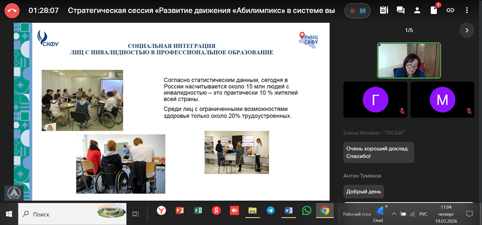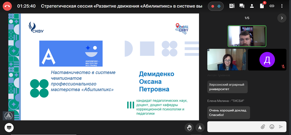 Ведущий специалист РУМЦ по обучению инвалидов и лиц с ОВЗ ФГАОУ ВО «Северо-Кавказский федеральный университет» Оксана Петровна Демиденко выступила с докладом «Наставничество в системе чемпионатов профессионального мастерства «Абилимпикс».
