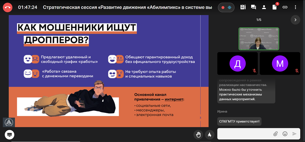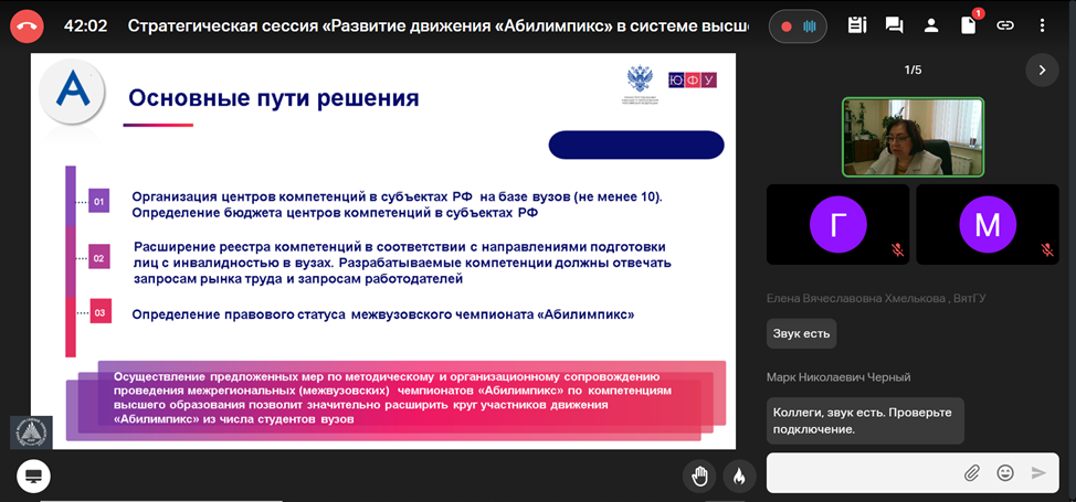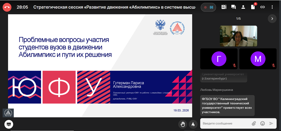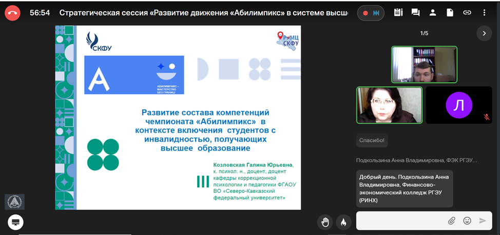 Заместитель директора РУМЦ РГПУ им. А.И. Герцена Е.Ф. Войлокова, специалист по учебно-методической работе И.Ф. Касацкая приняли участие в онлайн Стратегической сессии: «Развитие движения «Абилимпикс» в системе высшего образования».
