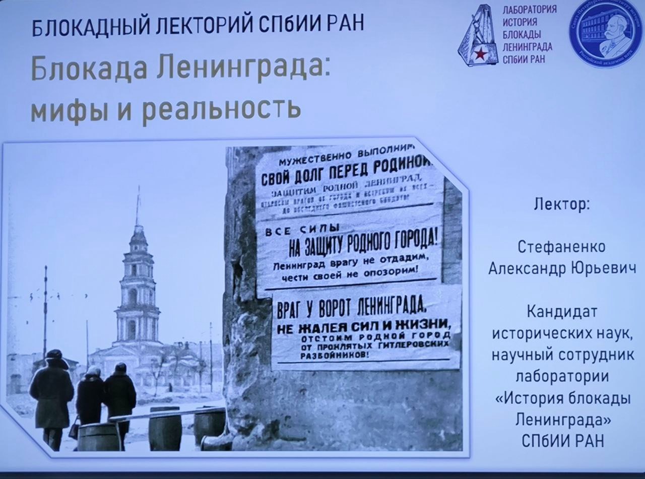 Спикером встречи стал кандидат исторических наук, научный сотрудник лаборатории «История блокады Ленинграда» СПбИИ РАН Александр Юрьевич Стефаненко. Он рассказал о мифах как о культурных явлениях, формирующихся на пересечении суеверий, рационального знания и общественных представлений. В частности, участники обсудили такие устойчивые образы, как «миф о 900 блокадных днях», «миф о повсеместном голоде и холоде в блокадном городе», «миф о банкете для руководства Ленинграда» и другие ошибочные или искажённые представления о жизни осаждённого города.