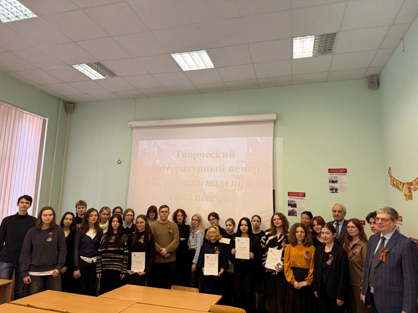 25 апреля на филологическом факультете РГПУ им. А. И. Герцена прошёл творческий литературный вечер «И, значит, нам нужна одна Победа», посвящённый 80-летию Победы в Великой Отечественной войне. Мероприятие стало финальным этапом творческой акции, в рамках которой студенты факультета подготовили собственные литературные произведения о войне, памяти и подвиге советского народа.