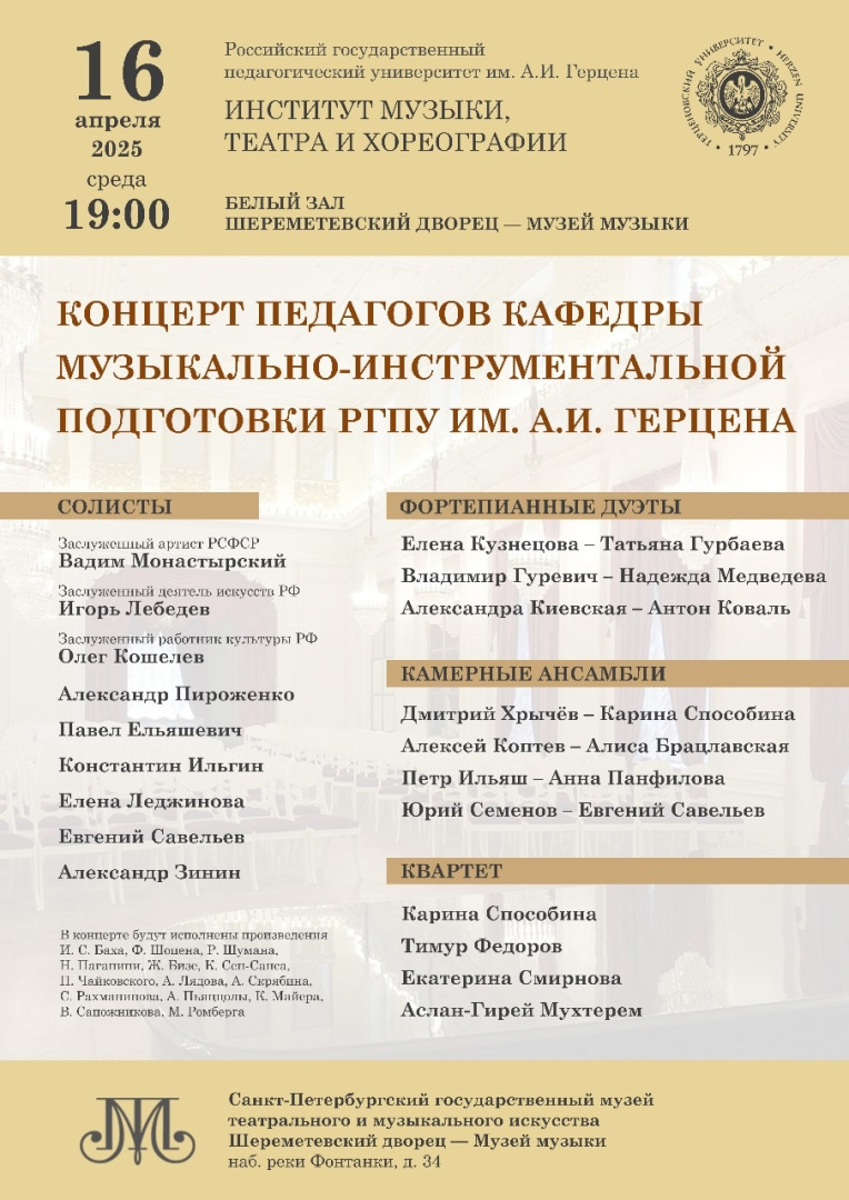 Институт музыки, театра и хореографии РГПУ им. А.И. Герцена по праву считается одним из лидеров художественного образования России. Институт имеет многолетнюю историю, которая позволяет сегодня его мастерам и педагогам предложить своим студентам широкий спектр образовательных программ высочайшего уровня.