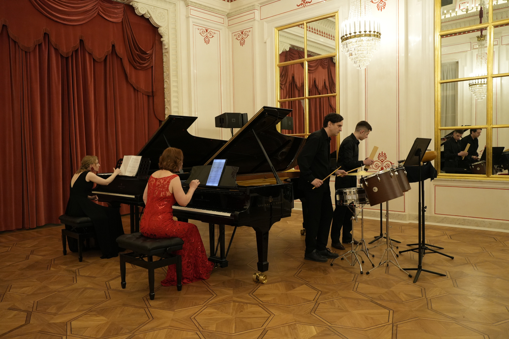 И вот мы подошли к финалу, и я намеренно оставила первый дуэт без комментариев, чтобы сейчас к нему вернуться, оглянувшись назад. Получилась арка, как театральный занавес! Открывая концерт, мастера фортепианного дуэта В. Гуревич — Н. Медведева обозначили высокую планку как профессионализма, так и градуса энергии. И заключительный номер по энергетике и театральности был также очень ярким. Таким произведения Щедрина услышал прекрасный пианист О. Ю. Малов, который и сделал уникальное переложение для 2 фортепиано и ударных (К. Способина — Е. Смирнова, Т. Федоров — А. Мухтерем).