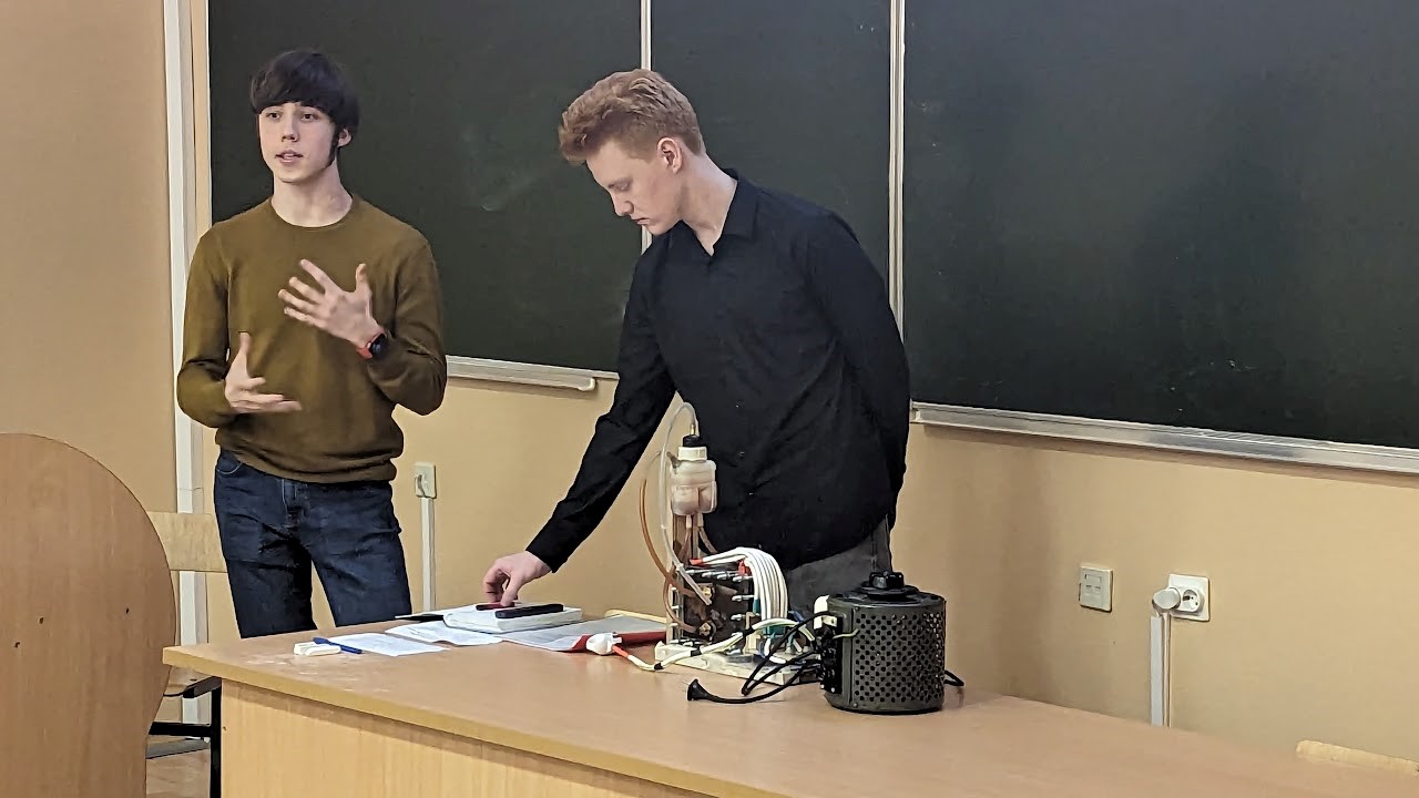 Учащиеся 11 класса Автономной некоммерческой общеобразовательной организации «Центр Искусства Воспитания «Общеобразовательная Вальфдорская школа и детский сад» Егор Абросимов и Михаил Сериков защищают исследовательскую работу «Создание водородного генератора»