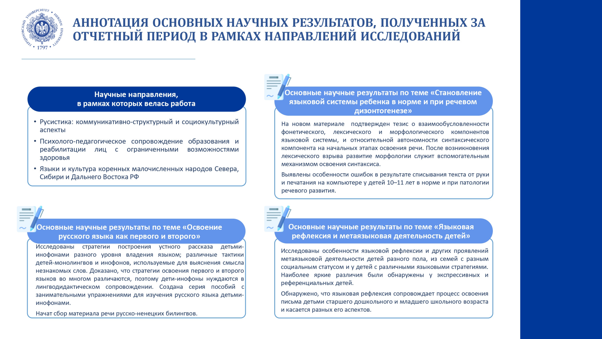 Изучение освоения русскоязычным и двуязычным ребенком русского языка (ранний, дошкольный и младший школьный возраст): фонетики, лексики и фразеологии, морфологии, словообразования, синтаксиса.