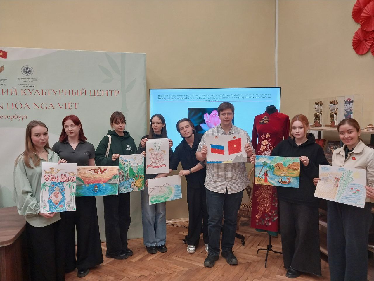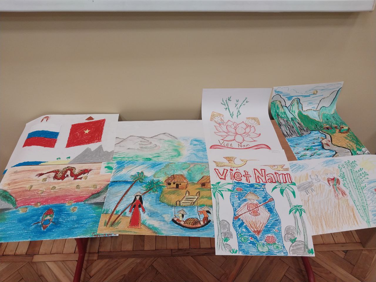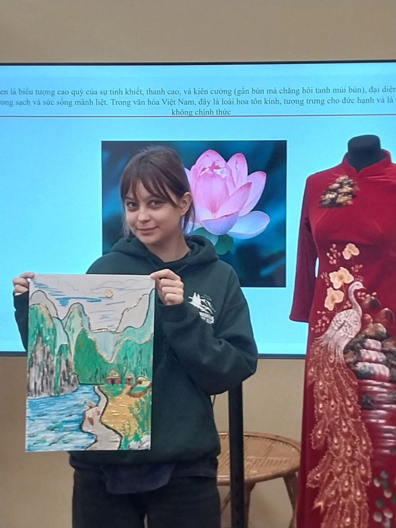 После лекции студенты продемонстрировали полученные знания в формате рисунков по теме «Вьетнам в моих глазах». Легкой кистью своей руки в атмосфере вьетнамских традиционных песен студенты изобразили главные символы страны во всем объеме необычных красок, присущих культуре Вьетнама.