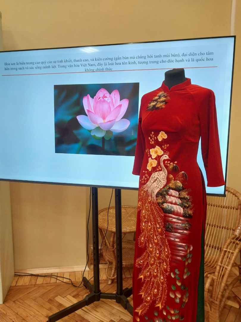 Студентам был показан «Аозай» – традиционный вьетнамский костюм, украшения на котором обозначают благополучие и счастье. Традиционный костюм с высоким воротником и двумя полами обычно украшается цветочной, орнаментальной и сюжетной вышивкой и носится с конусной шляпой «Нон». Вьетнамские женщины носят «Аозай» на торжественных мероприятиях, на Новый год и даже в школах.