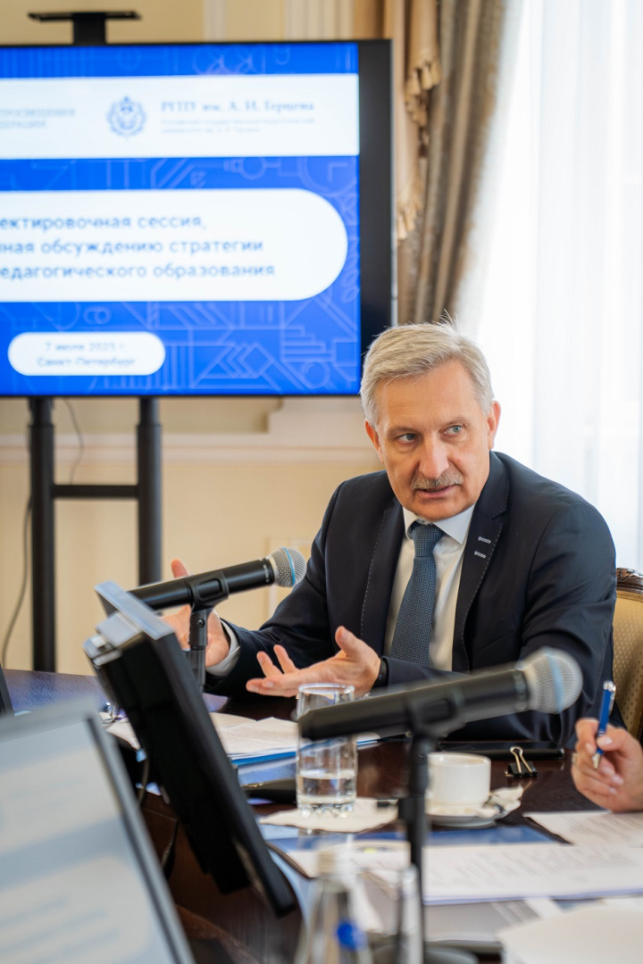 В РГПУ им. А. И. Герцена прошла проектировочная сессия, посвященная стратегии развития педагогического образования. Под руководством заместителя Министра просвещения Российской Федерации Ольги Колударовой ректоры педагогических вузов России обсудили обновление «Ядра высшего педагогического образования», развитие психолого-педагогических классов, целевой прием на программы педагогического образования, подготовку учителей по естественно-научным предметам и математике и педагогов для системы СПО, трудоустройство выпускников и другие вопросы. По итогам сессии были сформированы три рабочие группы по направлениям: «Будущий учитель», «Образ педагогического образования для всех», «Я — учитель, я — наставник».