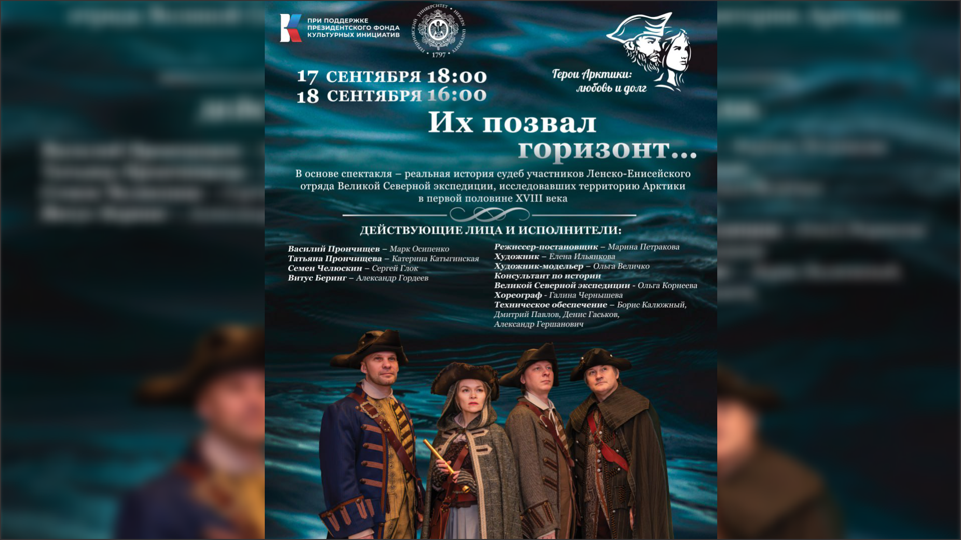 В основу спектакля «Их позвал горизонт…» положена реальная история судеб участников Ленско-Енисейского отряда Великой Северной экспедиции, которая исследовала территорию Арктики в первой половине XVIII века. Показы спектакля пройдут 17 сентября в 18:00 и 18 сентября в 16:00 в Колонном зале университета. Видеозапись спектакля будет доступна по ссылке.