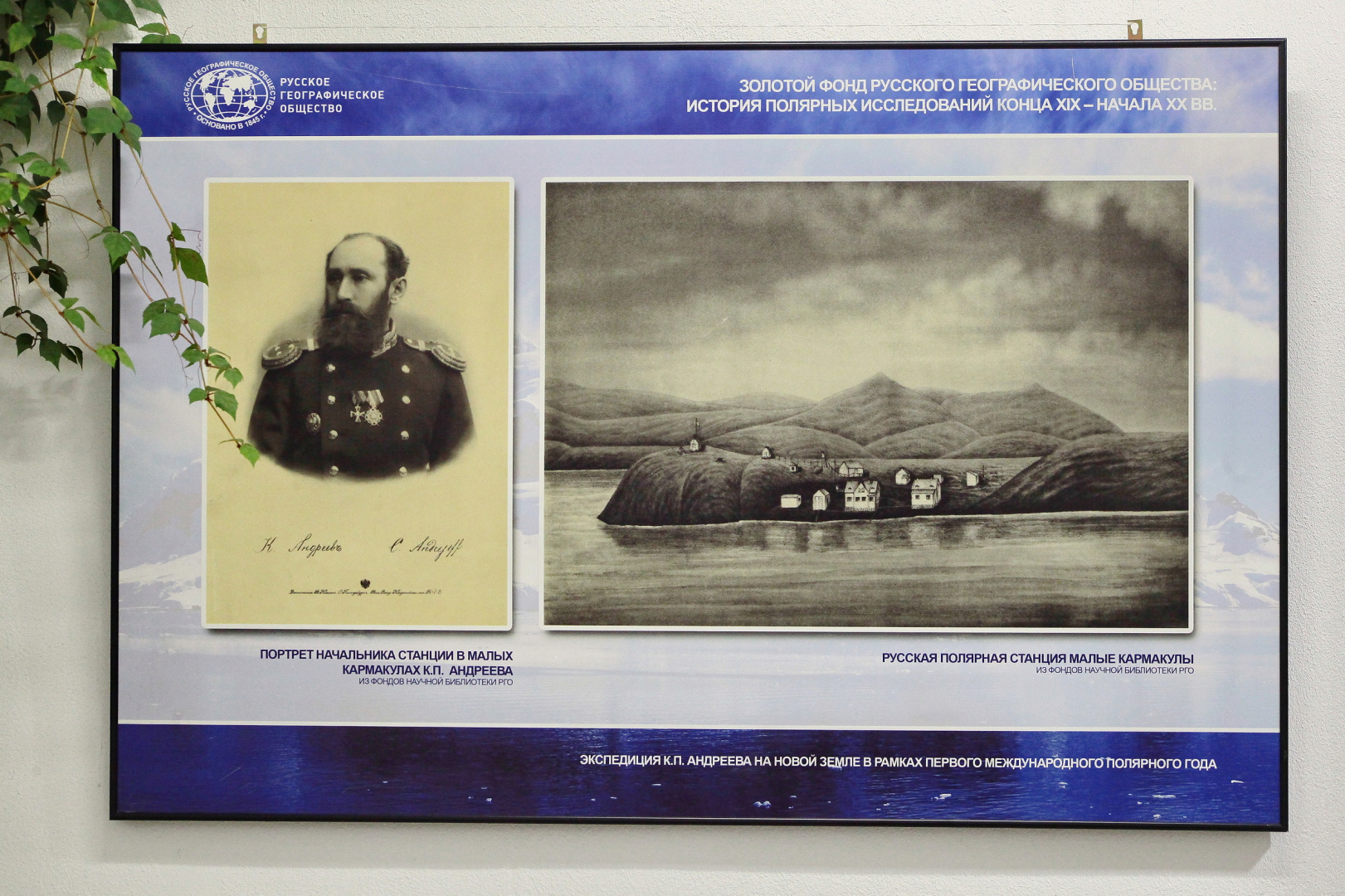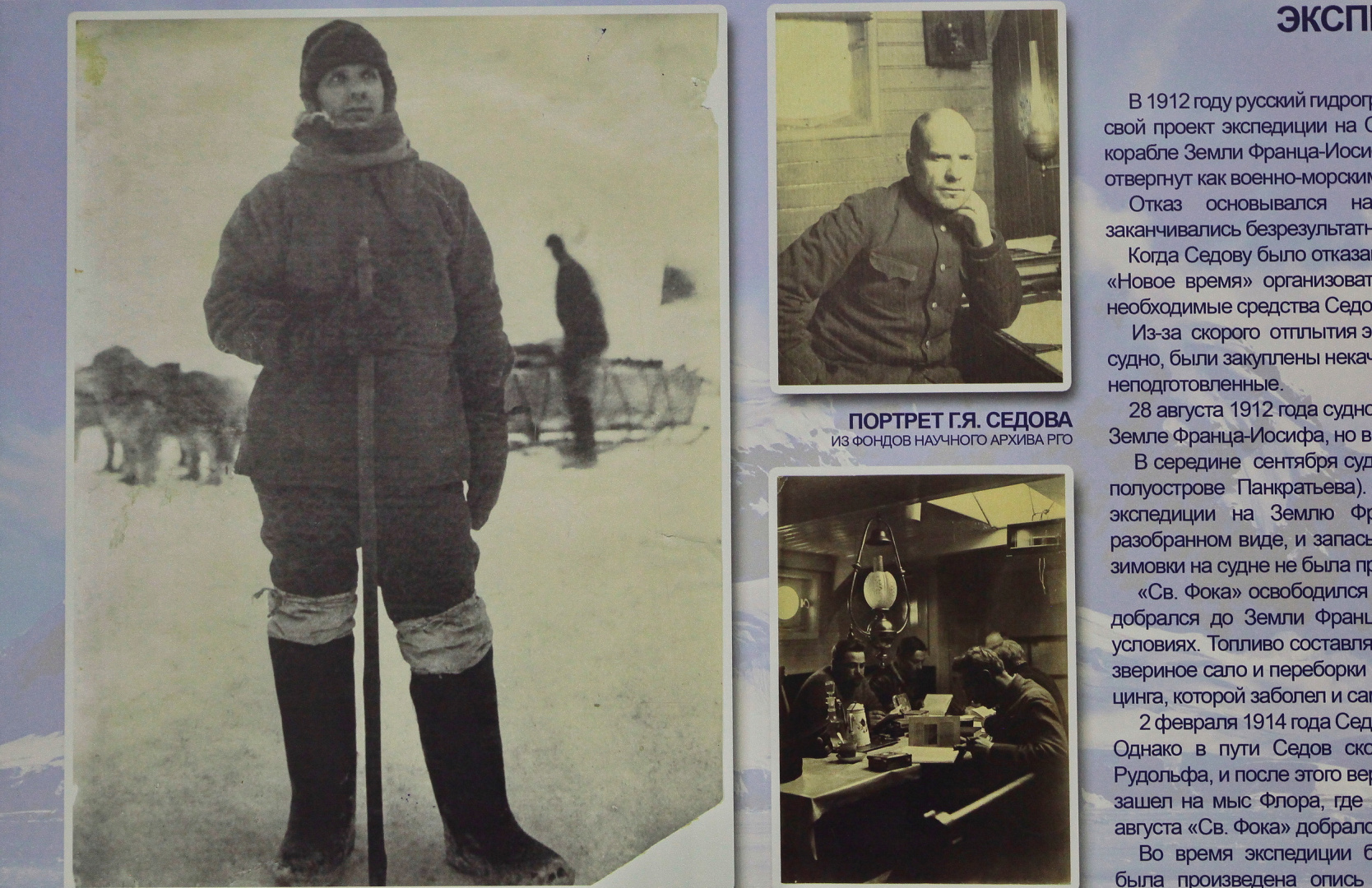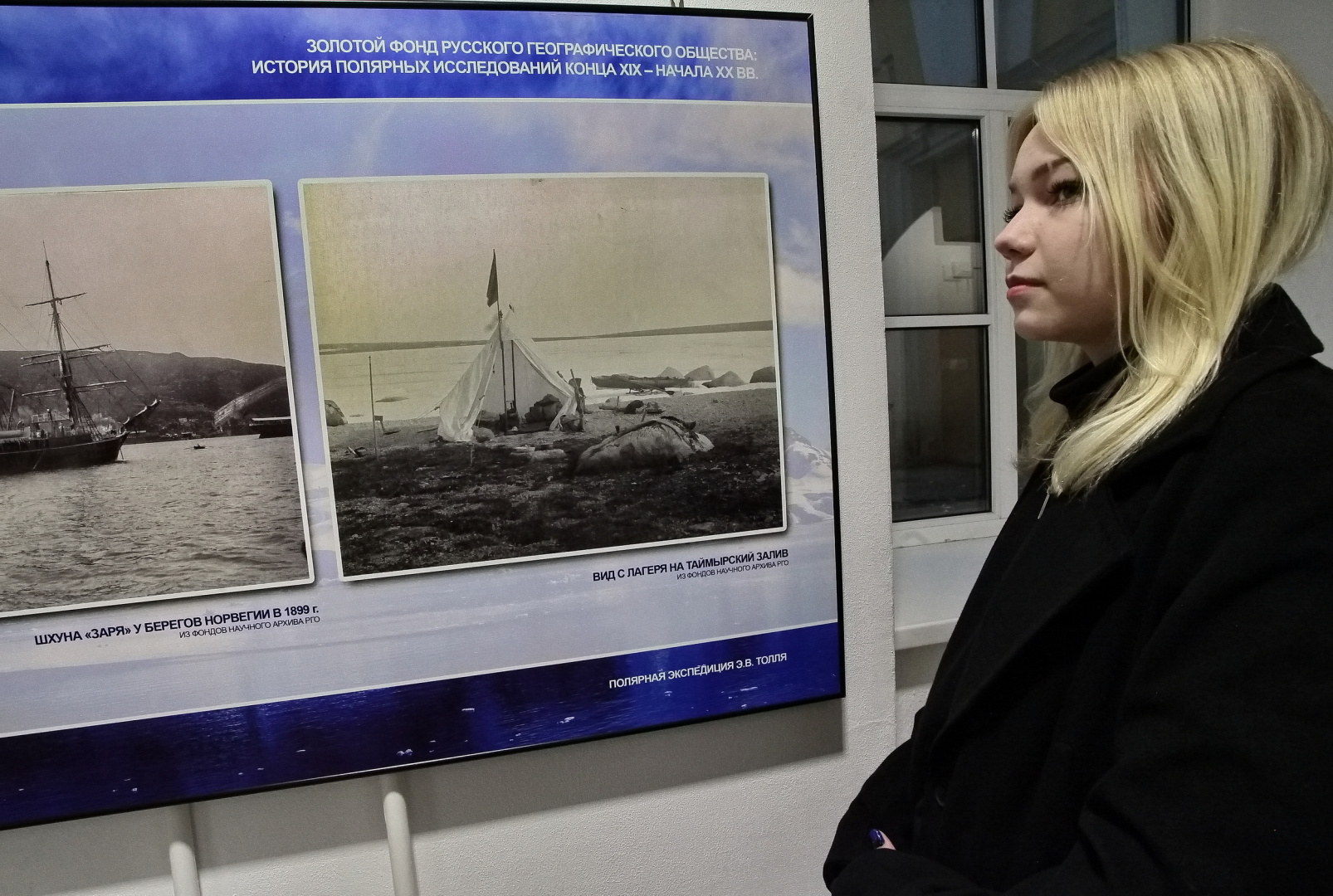 Экспозиция представляет редкие архивные материалы из коллекции РГО: фотографии, рисунки, карты и документы участников великих экспедиций, заложивших основу отечественной арктической науки. Особое место занимают материалы Русской полярной экспедиции (1900–1902) под руководством геолога Эдуарда Толля, задачей которой было исследование Новосибирских островов и поиски легендарной «Земли Санникова». Несмотря на трагическую гибель руководителя и части экипажа, результаты экспедиции стали важной вехой в истории отечественной географии: были нанесены на карту новые территории Таймыра и архипелага Норденшельда, открыт остров Стрижева.