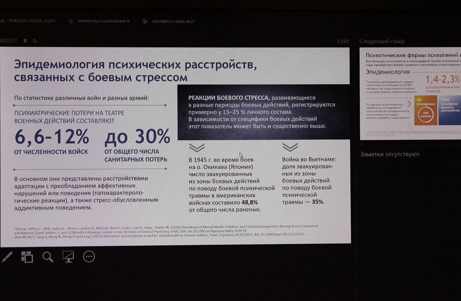 После пленарного заседания состоялись дискуссии на такие темы, как роль антидепрессантов в терапии синдрома зависимости от алкоголя, использование математического моделирования в диагностике депрессии, терапия психических расстройств у военнослужащих, речевые маркеры депрессии, и другие.