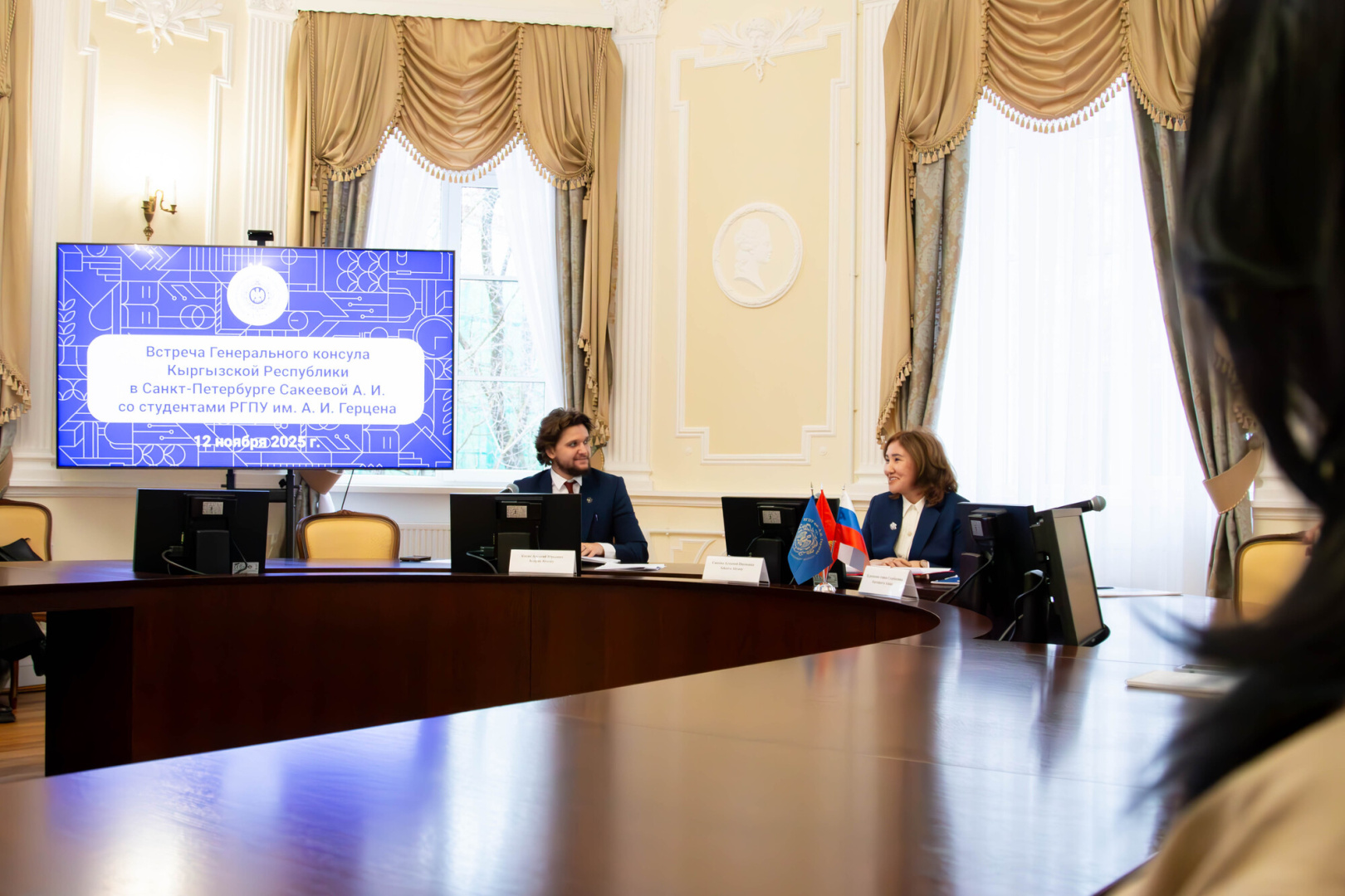 В Герценовском университете в рамках приема делегации Генерального консульства Кыргызской Республики в Санкт-Петербурге состоялась встреча дипломатов со студентами — гражданами Киргизии. Учащиеся задали вопросы об образовательных проектах, академическом обмене, поддержке для молодежи.