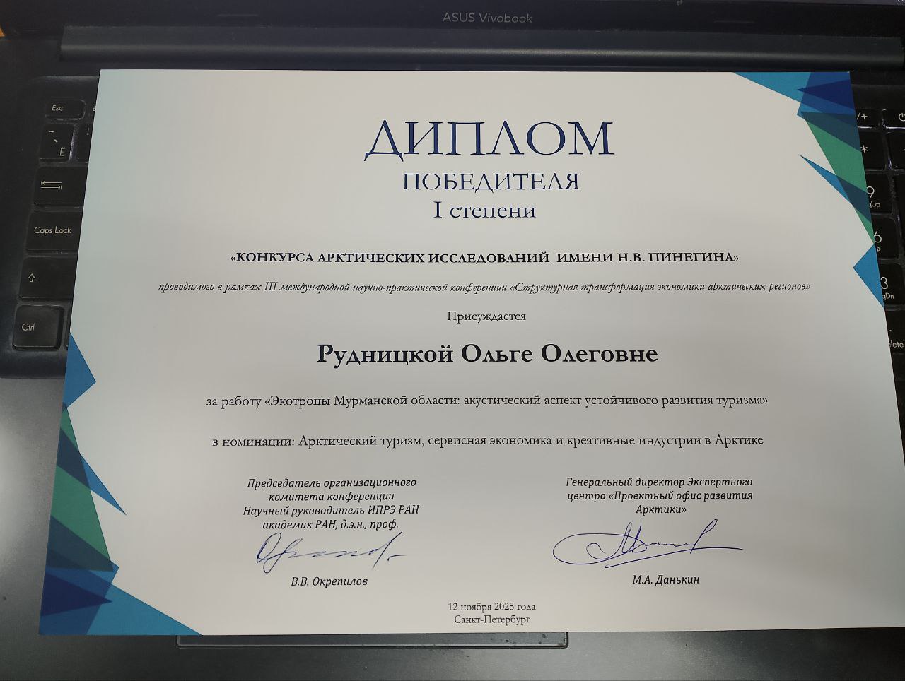 Заместитель председателя Совета научно-образовательного кластера «Арктика» РГПУ им. А. И. Герцена, доцент факультета географии Ольга Подшувейт выступила с докладом «Социокультурный потенциал Мурманской области как фактор конкурентоспособного развития территории» на тематической секции «Кадровое и инфраструктурное обеспечение экономики Арктических регионов». Кроме того, в рамках конференции прошел конкурс арктических исследований имени Н. В. Пинегина для молодых ученых. Его организаторами выступили ИПРЭ РАН и Экспертный центр «Проектный офис развития Арктики» (ПОРА). Студентка 3 курса факультета географии Ольга Рудницкая стала победителем I степени с научной работой «Экотропы Мурманской области: акустический аспект устойчивого развития туризма» в номинации «Арктический туризм, сервисная экономика и креативные индустрии в Арктике».