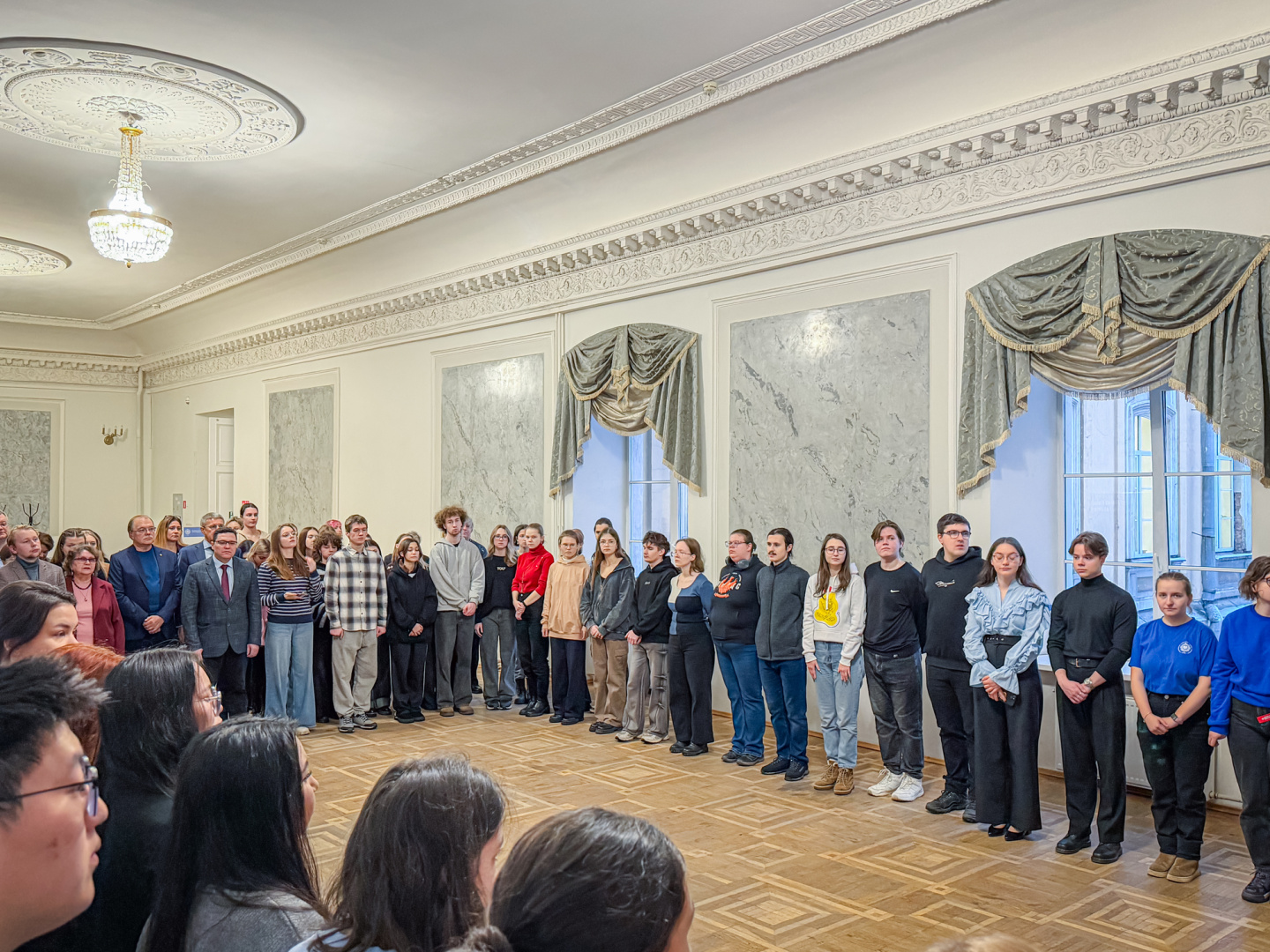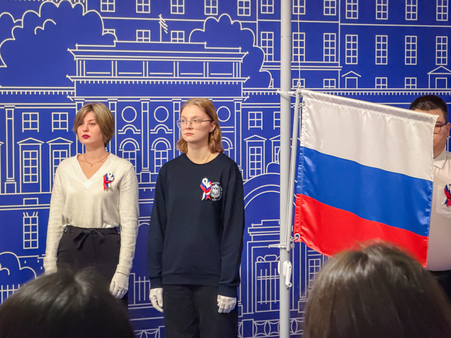 Почетное право поднять государственный флаг РФ было предоставлено лучшим студентам, проявившим себя в учебе, науке и общественной жизни. Ими стали студентка 1 курса института народов Севера, член Санкт-Петербургского Ямальского землячества ассоциации «Ямал-Потомкам!», победитель 12-го Всероссийского слета юных полярников «Наша Планета — 2025» Лидия Салиндер, студентка 4 курса института педагогики, руководитель Герценовского игрового клуба, организатор интеллектуальной викторины, посвященной 80-летию Победы в Великой Отечественной войне Евгения Степанович, студентка 3 курса института физики, боец студенческого отряда проводников «Романтик», член студенческого совета, участник Санкт-Петербургского международного научно-образовательного салона и Двенадцатого Евразийского молодежного инновационного конвента Людмила Титова и студент 3 курса факультета химии, обладатель благодарности за участие в организации и проведении Санкт-Петербургского фестиваля научных театров «Наука всем!» и диплома за лучший стендовый доклад на фестивале Ярослав Григорьевский.