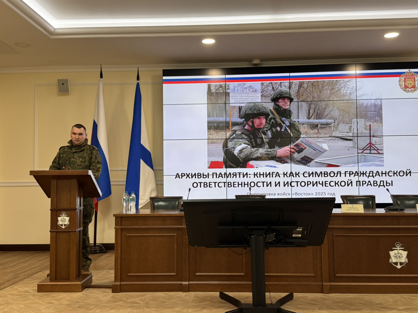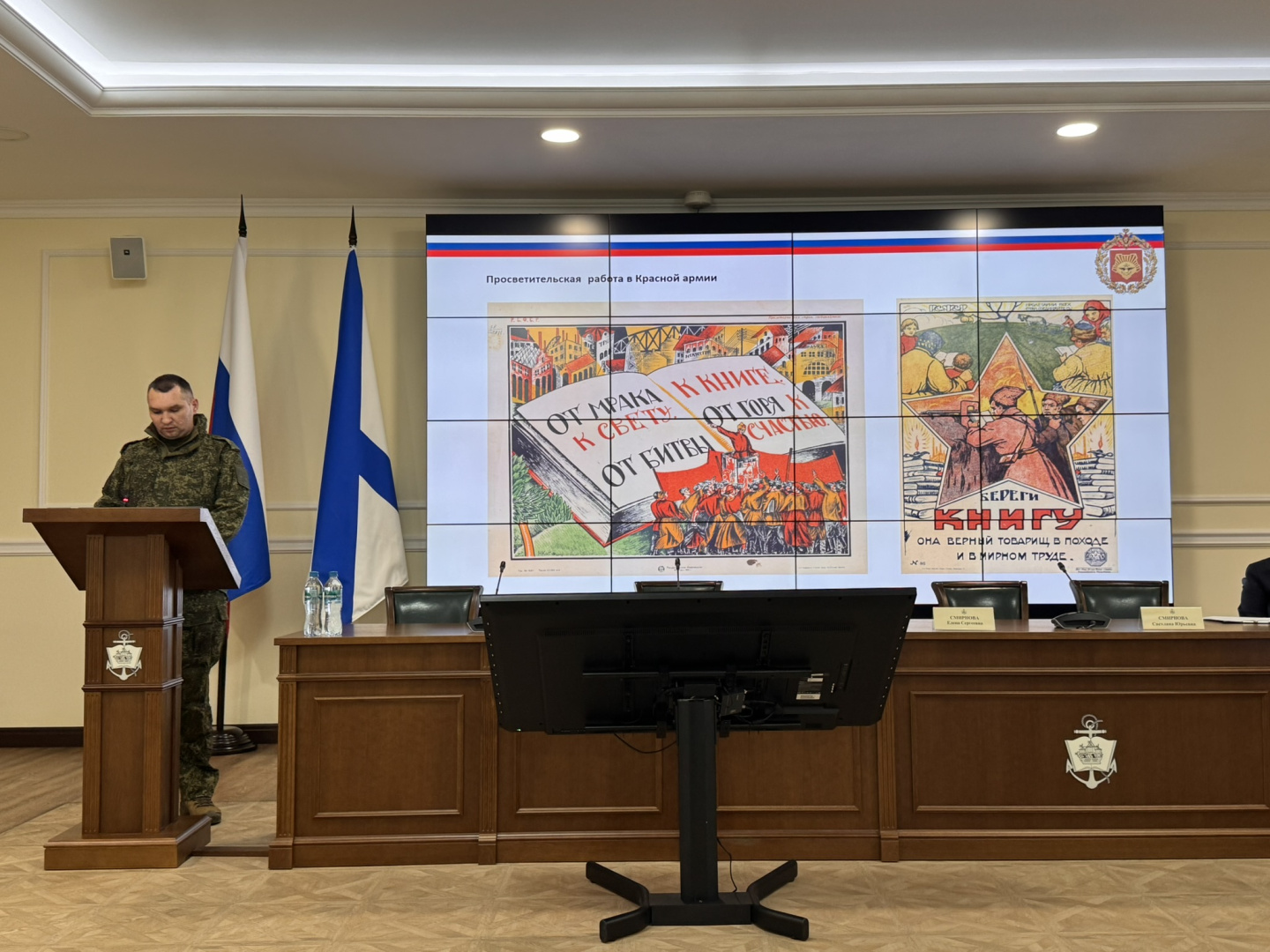 На открытии круглого стола военных библиотек прозвучали приветствия заместителя Министра обороны РФ — начальника Главного военно-политического управления Вооруженных Сил РФ Виктора Горемыкина и Главнокомандующего Военно-Морским Флотом Александра Моисеева. С докладами выступили кадровые офицеры, прибывшие на круглый стол из воинской части в зоне боевого соприкосновения: начальник отделения военно-патриотической работы и взаимодействия с общественными организациями военно-политического управления Восточного военного округа Антон Саяпин и участник боевых действий, офицер военно-политического управления Восточного военного округа по организации социально-психологического сопровождения и реабилитации участников СВО и членов их семей Антон Палеев. Они рассказали о важности, необходимости и востребованности даже небольших полевых библиотек, которые формируются в боевых частях, отметили интерес военнослужащих к русской классической литературе, проинформировали о том, как военно-политическое управление решает вопросы различий в уровне культурной подготовки участников боевых действий. Особое внимание было уделено готовности библиотек разного уровня и подчинения во всех регионах России к возвращению участников боевых действий к мирной жизни. По мнению Антона Палеева, библиотеки могут стать нишей психологической разгрузки и возможности остаться одному, пространством для налаживания коммуникации, социальных и профессиональных взаимосвязей — в зависимости от потребностей и эмоционального состояния как военнослужащих, так и родственников.
