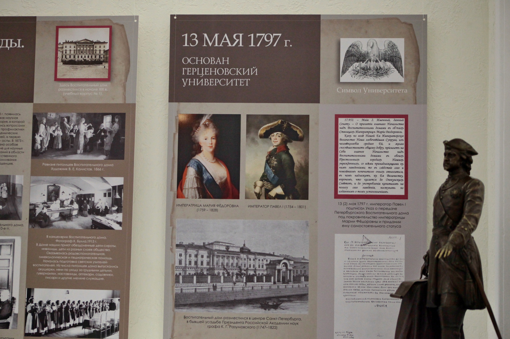 Первый зал погружает посетителей в период с 1797 по 1918 годы, от основания Петербургского воспитательного дома по указу императора Павла I. Экспозиция рассказывает о первых специализированных классах для одаренных детей, созданных императрицей Марией Федоровной, и о первой научной лаборатории, в которой изучали профилактику эпидемий. Во втором зале представлена история преобразования института в крупнейший педагогический вуз — ЛГПИ им. А. И. Герцена. Особое внимание уделено периоду 1920‒1940-х годов, когда закладывались современные научные школы, и героическим страницам Великой Отечественной войны, включая эвакуацию и работу на нужды фронта. Третий зал освещает новейшую историю университета, его развитие как многопрофильного научно-образовательного центра и лидера российского педагогического образования.