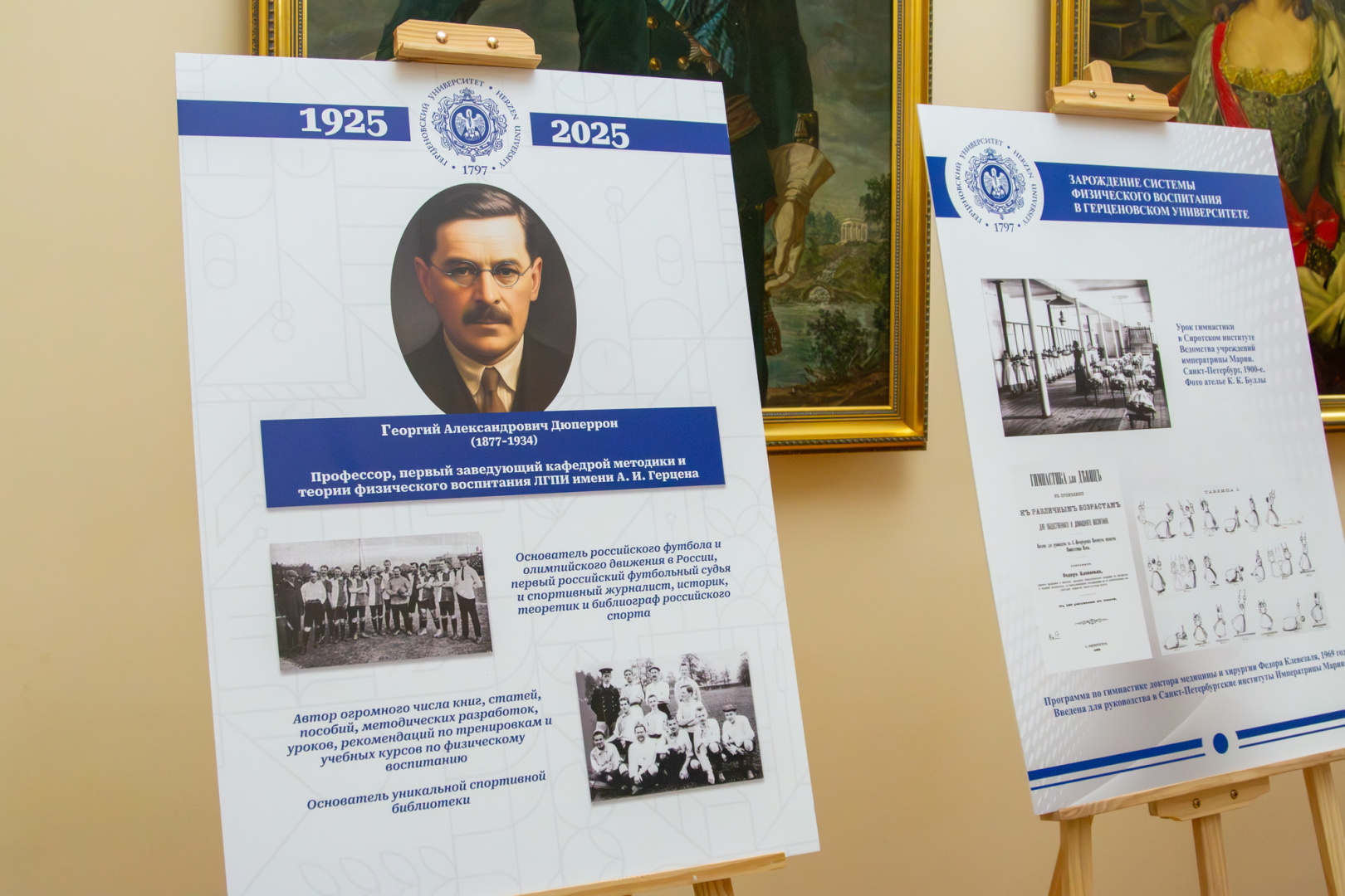 Директор института физической культуры и спорта Александр Фокин представил гостям университета фотовыставку об истории зарождения и развития физического воспитания в Герценовском университете. Его истоки восходят к середине XIX века, а профильная кафедра была сформирована в 1920-х годах. Первым заведующим кафедры физического воспитания стал Георгий Дюперрон — его портрет был также представлен широкой аудитории. Кроме того, Сергей Тарасов показал гостям портреты известных спортсменов Александра Дитятина и Галины Зыбиной, которые в преддверии юбилея пополнили галерею выдающихся деятелей Герценовского университета.