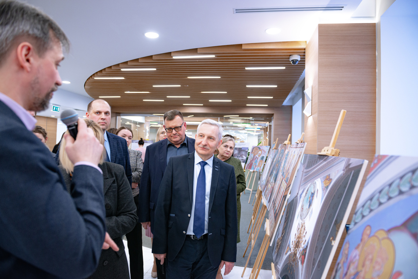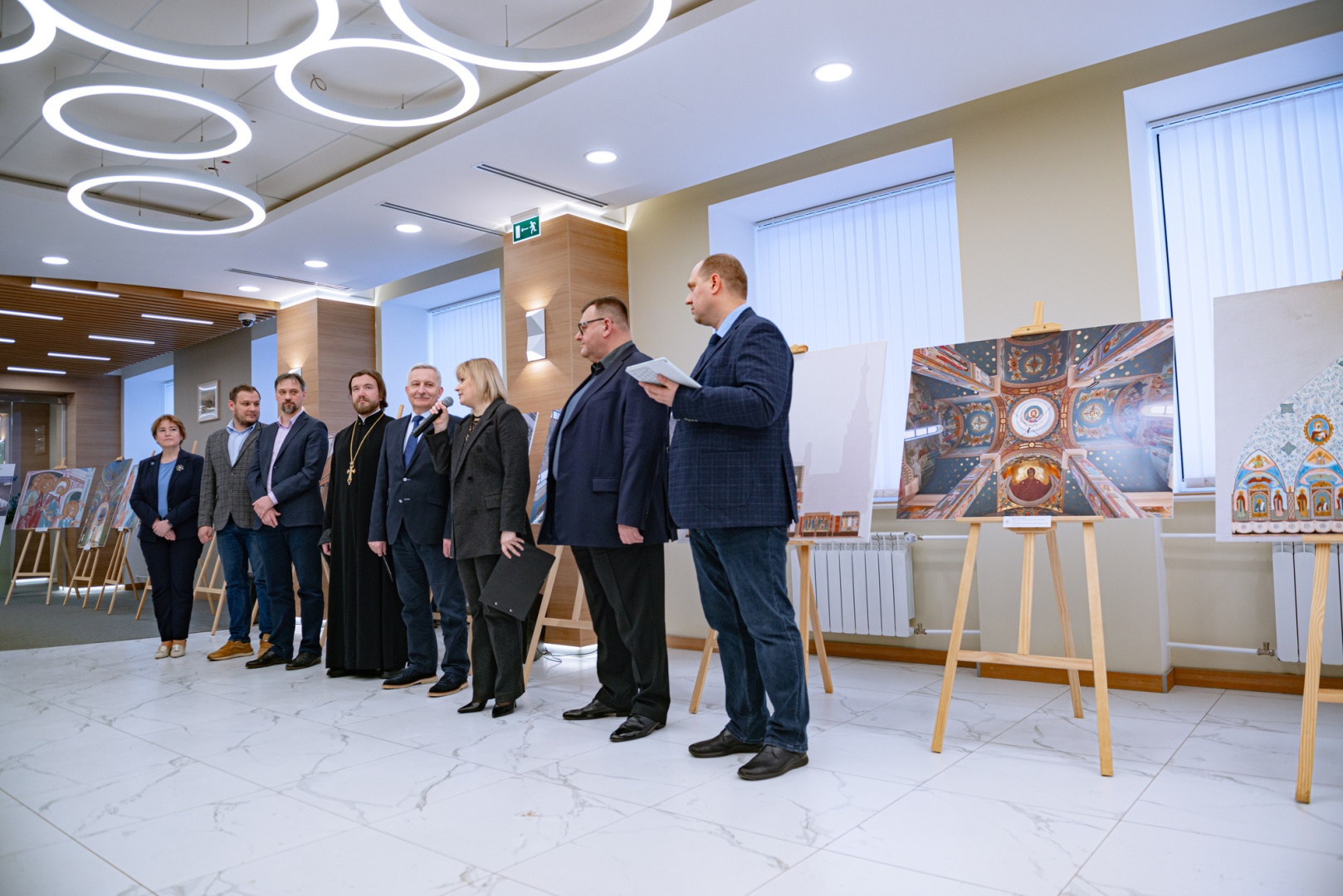 В холле Министерства просвещения Российской Федерации состоялось торжественное открытие выставки храмовой росписи «Образ и время». Здесь можно увидеть работы представителей РГПУ им. А. И. Герцена и мастерской церковного искусства «Образ» (Санкт-Петербург). В мероприятии приняла участие заместитель Министра просвещения РФ Ольга Колударова и академик Российской академии образования, ректор РГПУ им. А.И. Герцена Сергей Тарасов.