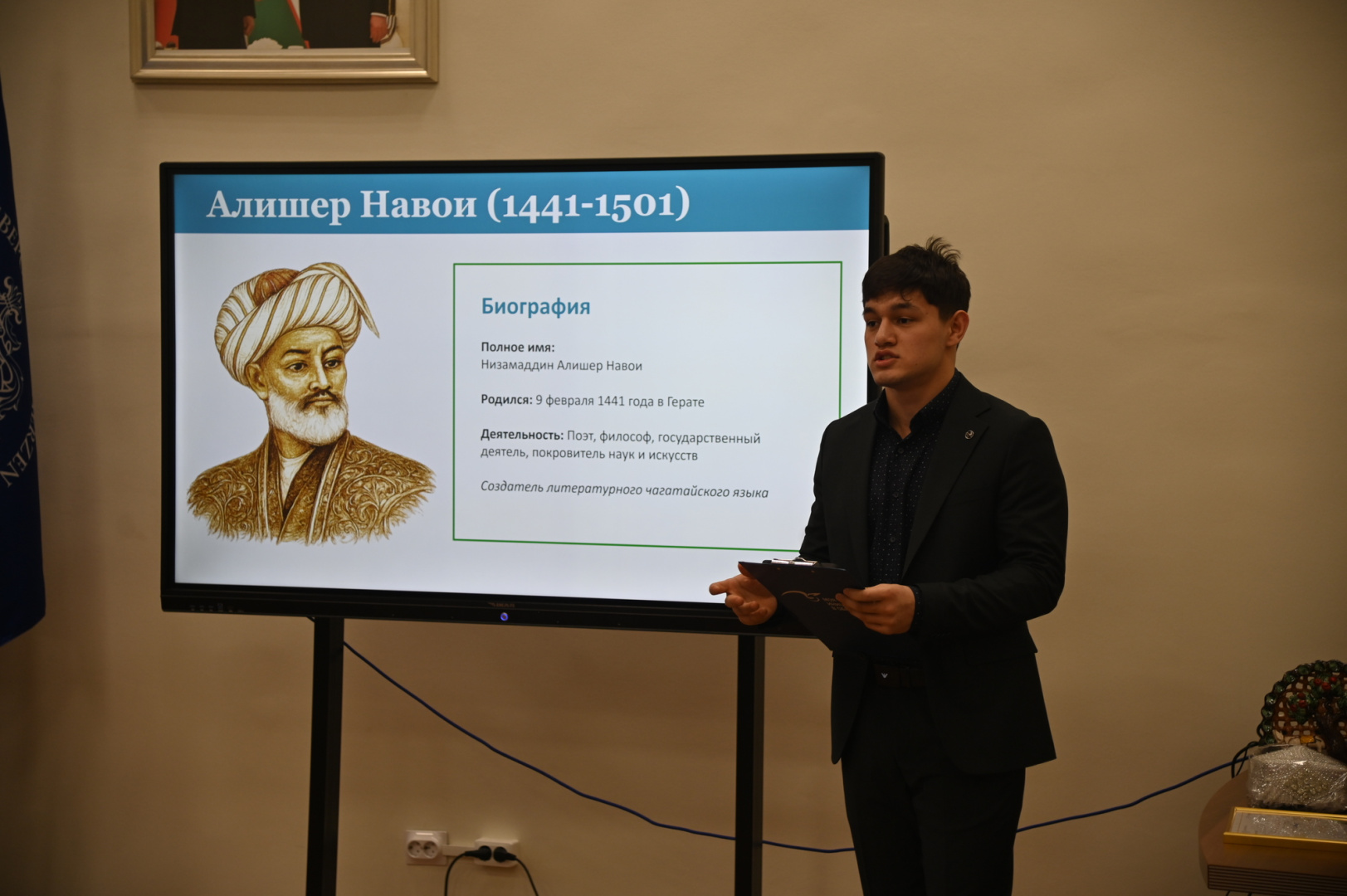 Студент юридического факультета Жемал Нормуродов представил биографию двух значимых фигур узбекской культуры. После этого участники мероприятия обсудили вклад Алишера Навои и Захириддина Бабура в формирование литературной традиции и культурного кода Узбекистана и поразмышляли о значении классической узбекской поэзии для молодого поколения. Важной частью встречи стало чтение произведений великих классиков на узбекском языке в исполнении магистранта института востоковедения Эркинбоя Маманазарова.