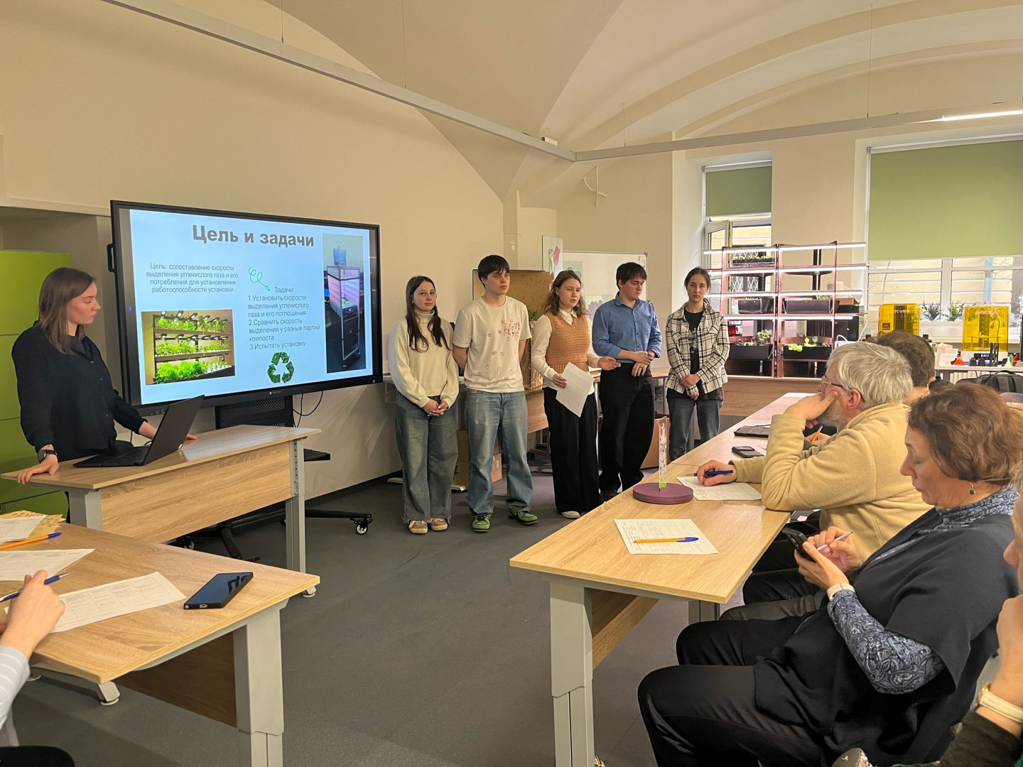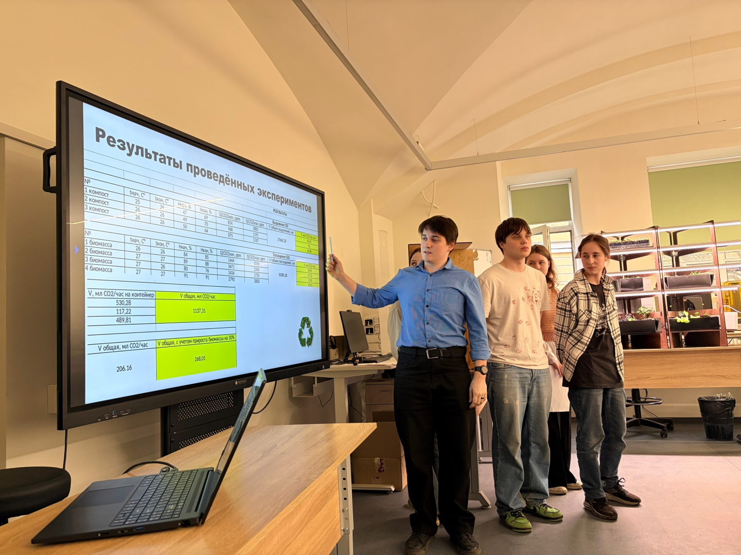 Одним из центральных проектов экошколы стала «Сити-компостерия» — модульная установка, позволяющая совмещать процессы компостирования и выращивания растений. Участники провели серию экспериментов, сопоставив скорость выделения углекислого газа при разложении органики и его поглощения растениями. Полученные данные подтвердили потенциал подобных решений для образовательных учреждений: установка может использоваться в школах и детских садах как инструмент экологического просвещения и практической работы с детьми.