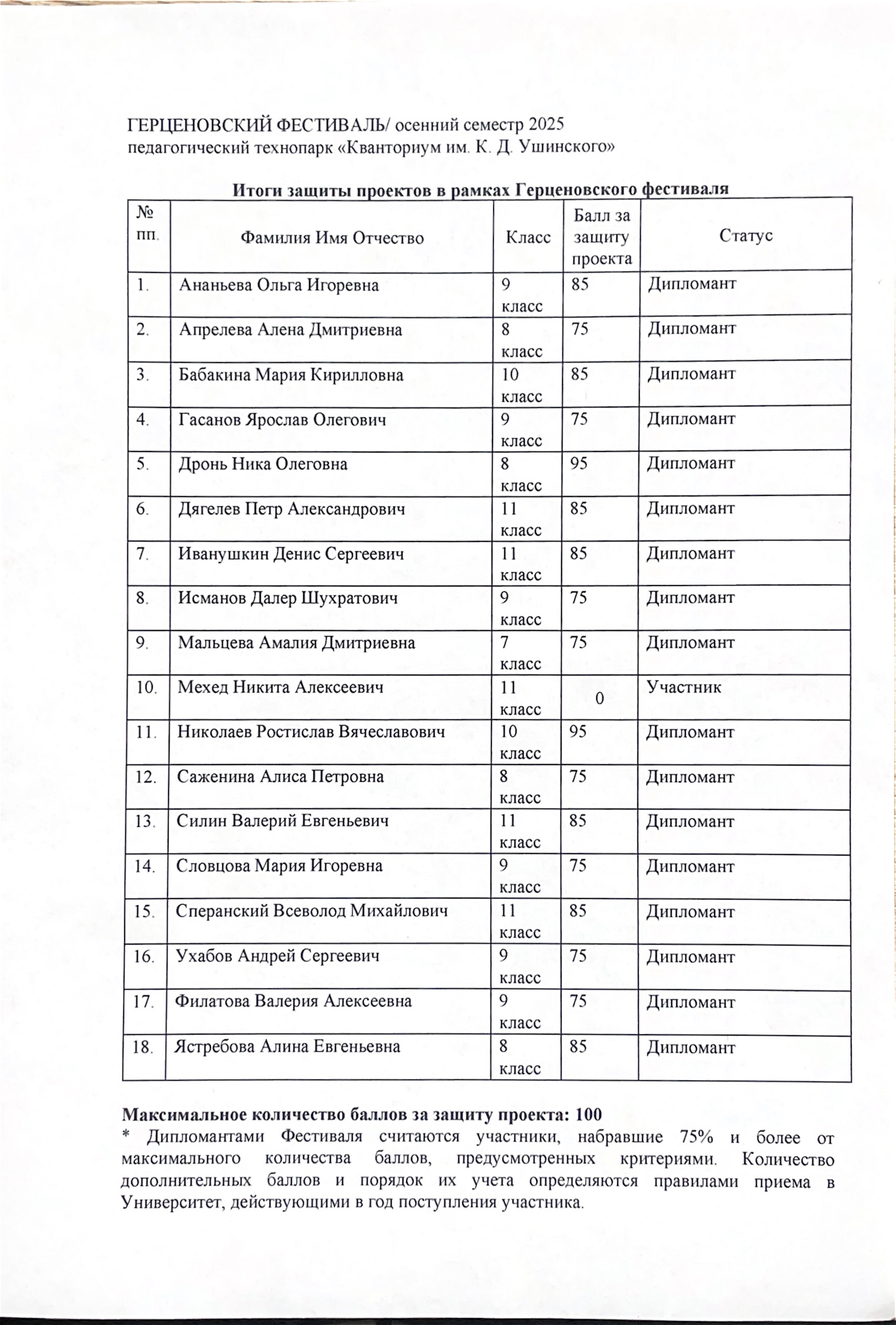 Результаты дипломантов учитываются в качестве индивидуальных достижений при поступлении на программы бакалавриата в соответствии с правилами прима в университет в текущем учебном году: диплом победителя/призера Фестиваля дает право на получение дополнительных баллов к результатам ЕГЭ/результатам вступительных испытаний в соответствии с правилами приёма. В 2026 году дипломанты получают дополнительные баллы к сумме ЕГЭ или результатам вступительных испытаний при поступлении в бакалавриат на любое направление подготовки в РГПУ им. А.И. Герцена. В 2025/2026 году дипломы будут оформлены после публикации правил приёма (20.01.2026) и размещены на диске. Доступ к папке с дипломами будет открыт по электронной почте, которую Вы указали при регистрации. Вам будет отправлено информационное письмо.