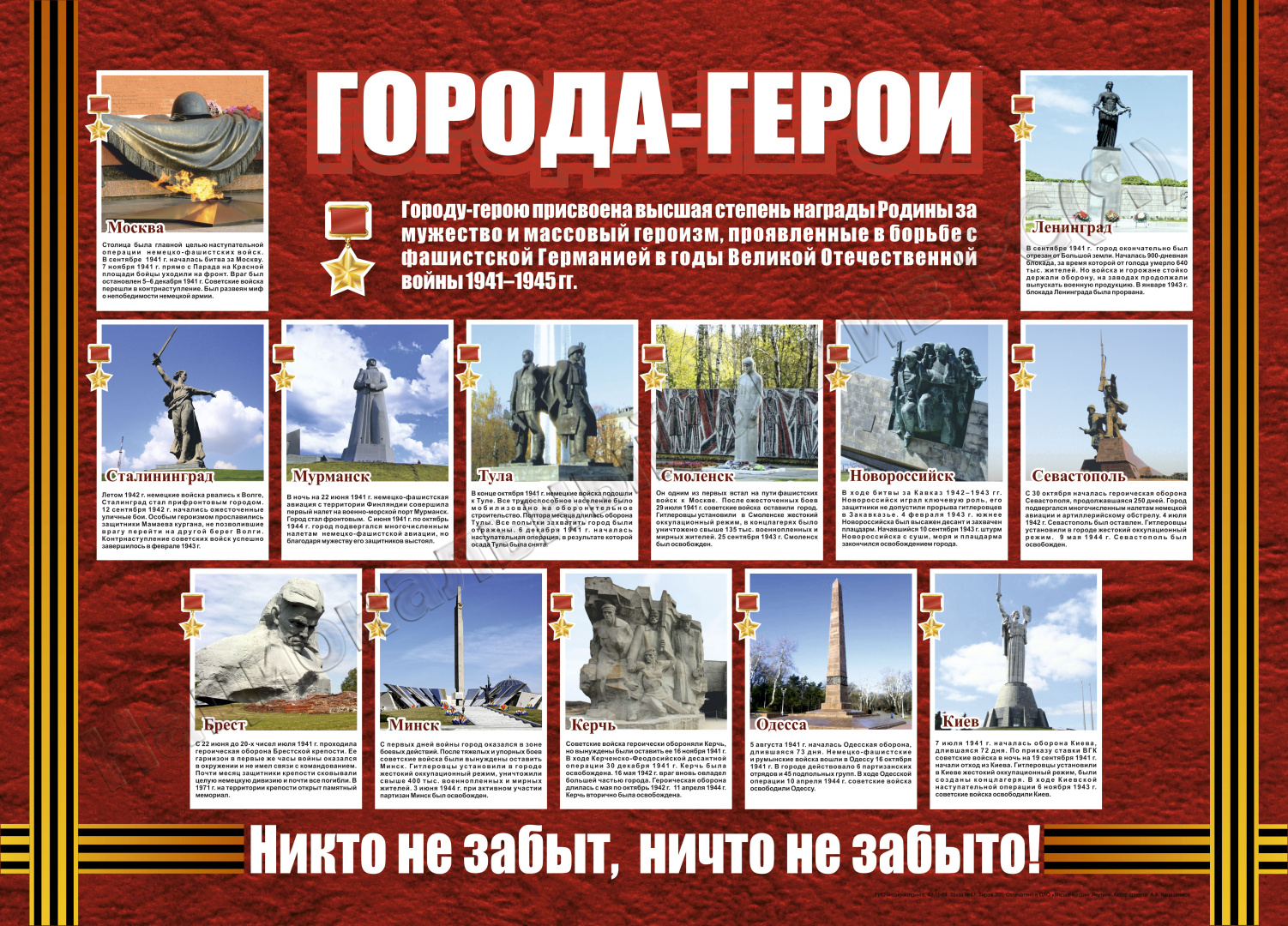 Города - герои — почётное звание, которого удостоены 12 городов, прославившихся своей героической обороной во время Великой Отечественной войны 1941—1945. Сегодня на презентации студенты познакомились с историей этих городов, жители которых проявили особое мужество и стойкость в борьбе с врагом. В презентации были освещены история присвоения почетного звания «Город-герой», подвиги защитников городов в годы войны, неоспоримый вклад городов в Победу, приведены памятные места и монументы. Фотографии и краткие тексты помогли в доступной форме закрепить знания.