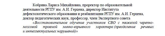 «Проект под нашим руководством реализуется три года, имеется опыт, результаты, нами опубликовано учебное пособие для дефектологов и статьи. Как показал мониторинг восстановительного обучения, результатами нашей работы является уменьшение степени выраженных речевых, когнитивных и эмоционально-речевых нарушений, восстановление социальных навыков, улучшение качества жизни пациентов», – отметила Лариса Кобрина.
