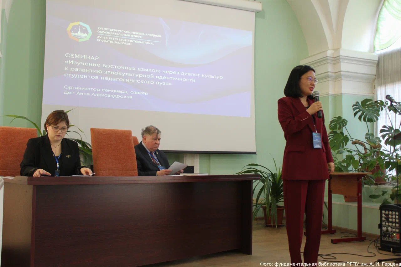 В рамках XVI Петербургского международного образовательного форума в РГПУ им. А.И. Герцена был проведен научно-практический семинар «Изучение восточных языков: через диалог культур к развитию этнокультурной идентичности студентов педагогического вуза». Организатором и модератором мероприятия выступила заведующая кафедрой восточных языков и лингводидактики, заместитель директора по учебной работе института востоковедения А. Ден. Участниками и гостями мероприятия стали педагоги общеобразовательных школ, преподаватели восточных языков и культур, бакалавры и магистранты Герценовского университета.