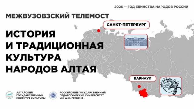 В пространстве «Точка кипения» состоялся межвузовский телемост «История и традиционная культура народов Алтая». Студенты, преподаватели и руководство Алтайского государственного института культуры (АГИК) и РГПУ им. А. И. Герцена вышли в эфир из студий Барнаула и Санкт-Петербурга, чтобы подвести промежуточные итоги совместного проекта «Скифский пояс Большого Алтая» и обсудить дальнейшие перспективы сотрудничества.
