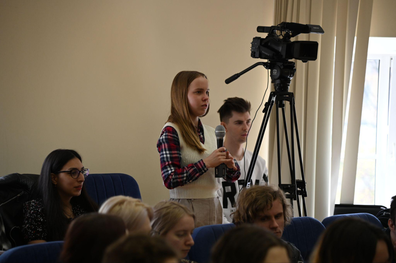 В своих вопросах студенты коснулись реформы системы оценивания, перспектив развития российского образования. Один из вопросов был о том, к кому стоит обратиться за помощью для того, чтобы воспитать счастливого человека.