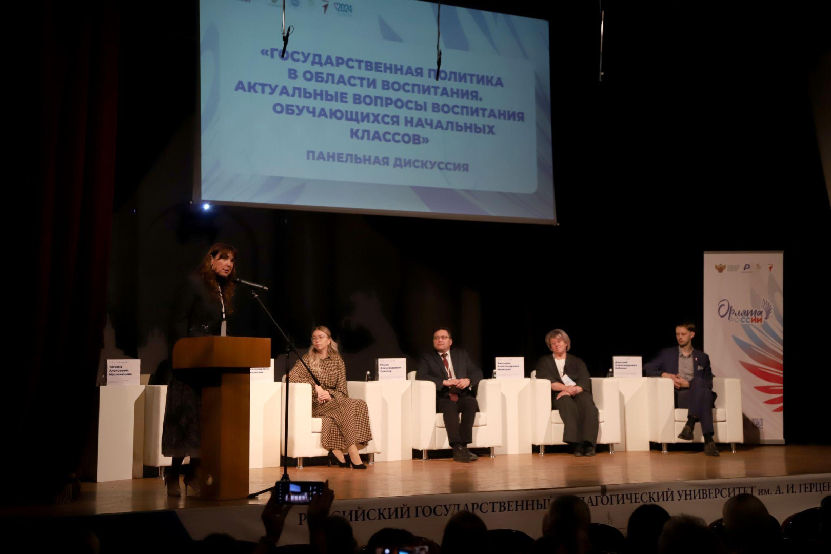 После церемонии открытия состоялась панельная дискуссия «Государственная политика в области воспитания: актуальные вопросы воспитания обучающихся начальных классов», в которой приняли участие представители Министерства просвещения, ВДЦ «Орленок» и «Росдетцентра». Модератором выступила заведующая кафедрой педагогики начального образования и художественного развития ребёнка института детства РГПУ им. А. И. Герцена Людмила Савинова.