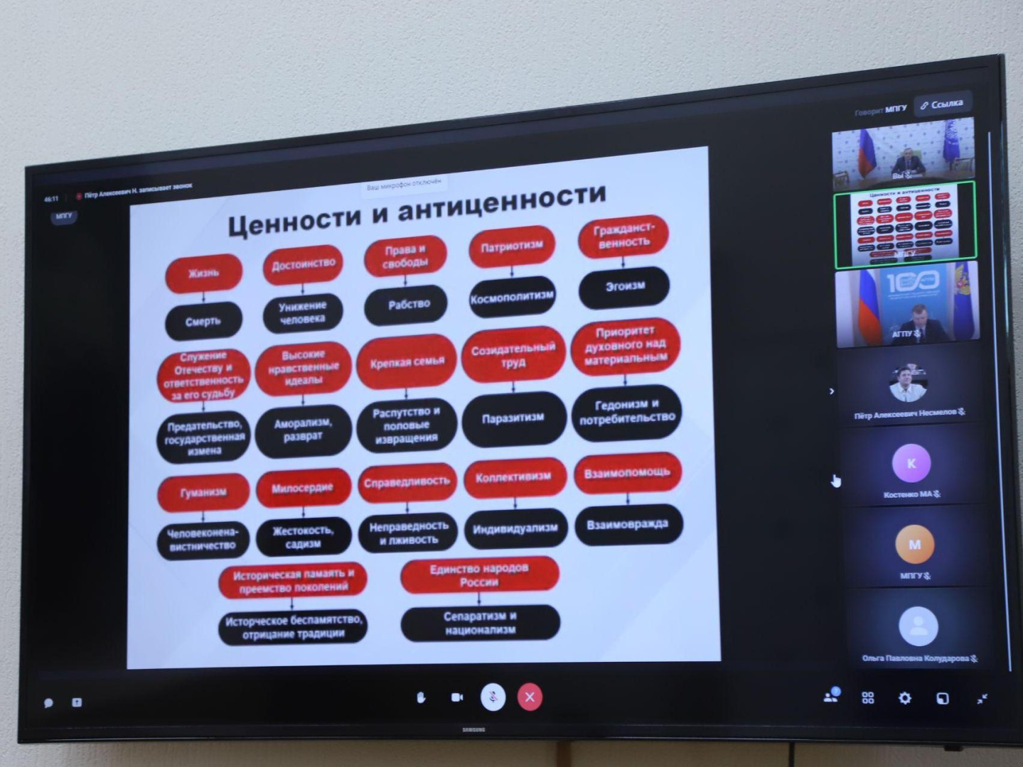 В ходе заседания обсуждались вопросы о стратегии цивилизационного возрождения России, передаче ценностей и смыслов в образовательном процессе. Заместитель министра просвещения Ольга Колударова отметила, что существует необходимость выработки общих подходов к работе в этой сфере, которые были бы отражены в планах воспитательной деятельности каждой образовательной организации.