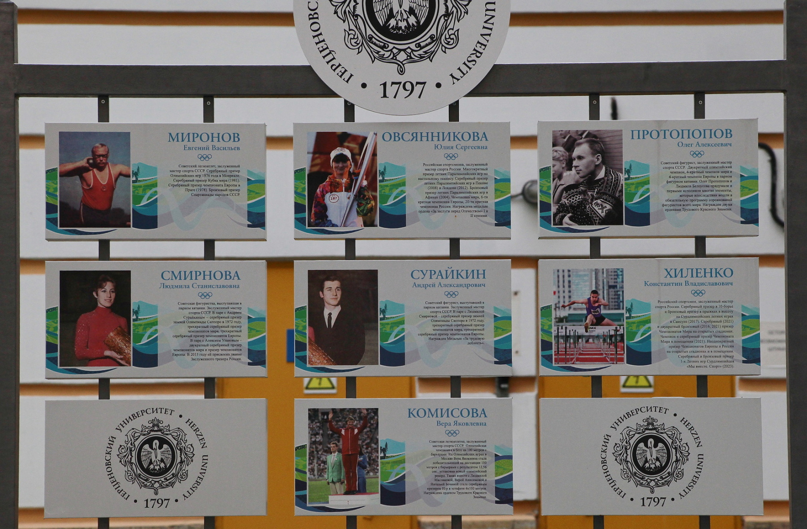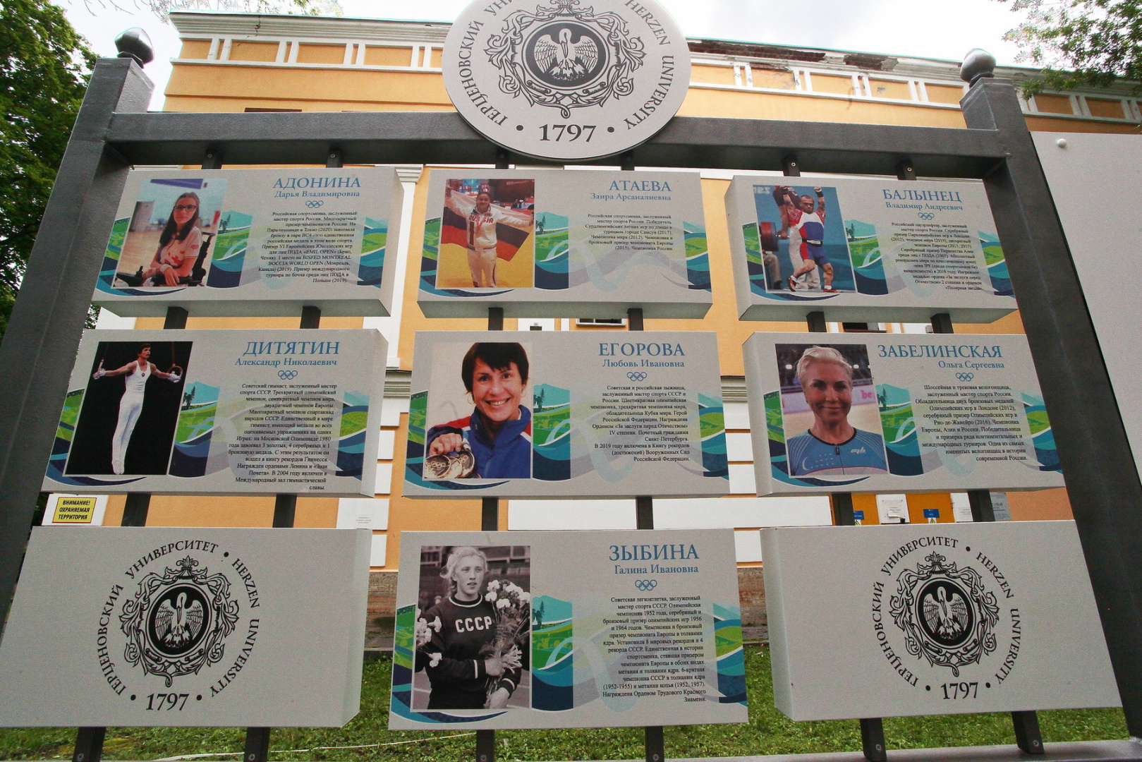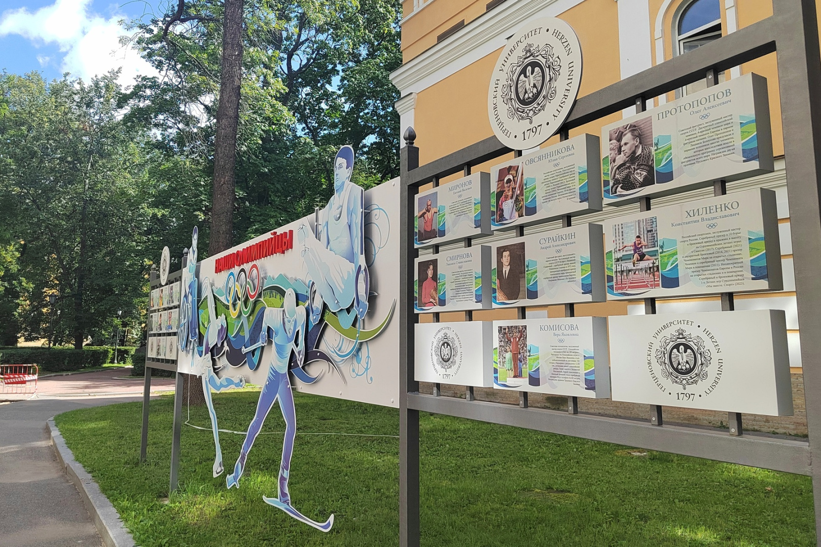 Ко Дню физкультурника на территории РГПУ им. А. И. Герцена установили стенд, посвященный олимпийцам, паралимпийцам и сурдлимпийцам вуза. На нем размещена информация о 14 педагогах и выпускниках, которые достигли выдающихся успехов в спорте. В ближайшее время появится информация еще о трех спортсменах.