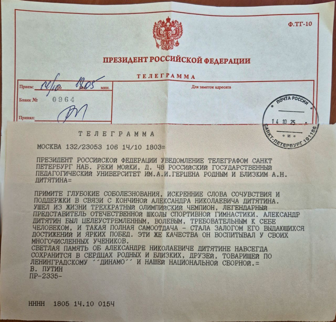 «Примите глубокие соболезнования, искренние слова сочувствия и поддержки в связи с кончиной Александра Николаевича Дитятина. Ушел из жизни трехкратный олимпийский чемпион, легендарный представитель отечественной школы спортивной гимнастики. Александр Дитятин был целеустремленным, волевым, требовательным к себе человеком, и такая полная самоотдача стала залогом его выдающихся достижений и ярких побед. Эти же качества он воспитывал у своих многочисленных учеников. Светлая паять об Александре Николаевиче Дитятине навсегда сохранится в сердцах родных и близких, друзей, товарищей по ленинградскому «Динамо» и нашей национальной сборной», — сказано в телеграмме.