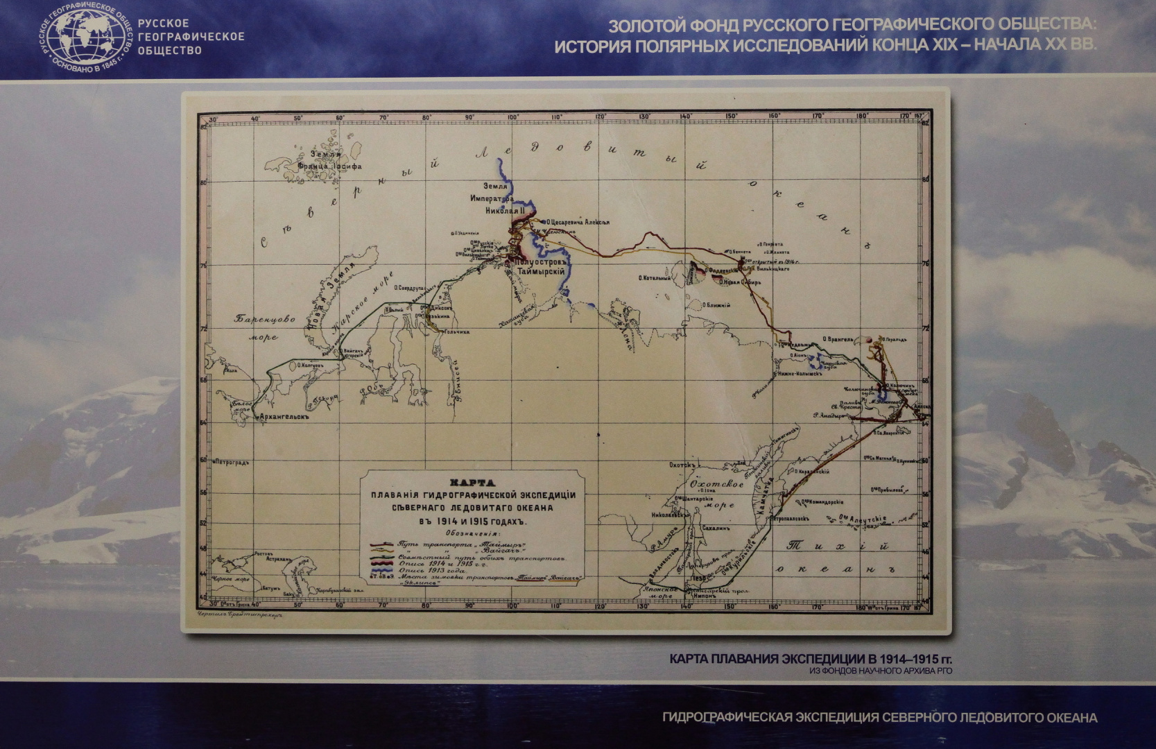 Экспозиция представляет редкие архивные материалы из коллекции РГО: фотографии, рисунки, карты и документы участников великих экспедиций, заложивших основу отечественной арктической науки. Особое место занимают материалы Русской полярной экспедиции (1900–1902) под руководством геолога Эдуарда Толля, задачей которой было исследование Новосибирских островов и поиски легендарной «Земли Санникова». Несмотря на трагическую гибель руководителя и части экипажа, результаты экспедиции стали важной вехой в истории отечественной географии: были нанесены на карту новые территории Таймыра и архипелага Норденшельда, открыт остров Стрижева.
