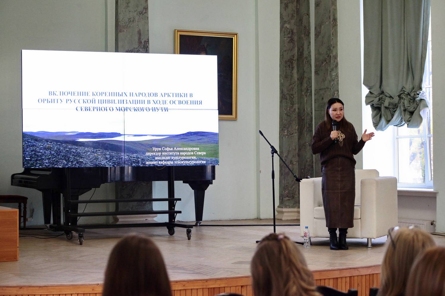 Программа конференции включила в себя пленарное заседание, где выступила директор института народов Севера Софья Урун с докладом, посвященным освоению Северного морского пути и роли этих исторических событий в судьбах коренных народов Арктики.