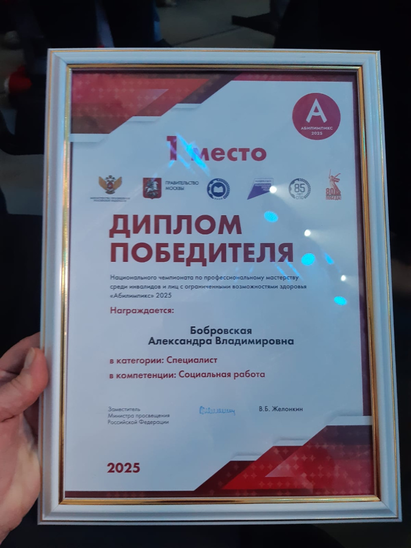 Аспирантка факультета биологии РГПУ им. А. И. Герцена Александра Бобровская заняла первое место в компетенции «Социальная работа» в финале национального чемпионата «Абилимпикс». Она участвовала в состязаниях в составе сборной Санкт-Петербурга. Подготовка к чемпионату велась под руководством директора реабилитационно-образовательного центра «Инклюзия» Герценовского университета Екатерины Вячеславовой.