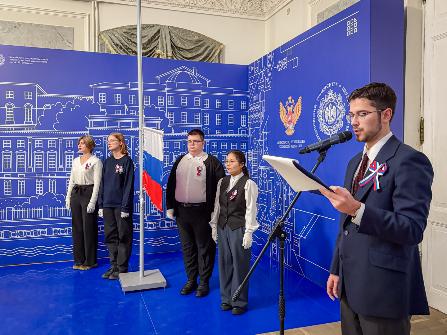 Почетное право поднять государственный флаг РФ было предоставлено лучшим студентам, проявившим себя в учебе, науке и общественной жизни. Ими стали студентка 1 курса института народов Севера, член Санкт-Петербургского Ямальского землячества ассоциации «Ямал-Потомкам!», победитель 12-го Всероссийского слета юных полярников «Наша Планета — 2025» Лидия Салиндер, студентка 4 курса института педагогики, руководитель Герценовского игрового клуба, организатор интеллектуальной викторины, посвященной 80-летию Победы в Великой Отечественной войне Евгения Степанович, студентка 3 курса института физики, боец студенческого отряда проводников «Романтик», член студенческого совета, участник Санкт-Петербургского международного научно-образовательного салона и Двенадцатого Евразийского молодежного инновационного конвента Людмила Титова и студент 3 курса факультета химии, обладатель благодарности за участие в организации и проведении Санкт-Петербургского фестиваля научных театров «Наука всем!» и диплома за лучший стендовый доклад на фестивале Ярослав Григорьевский.