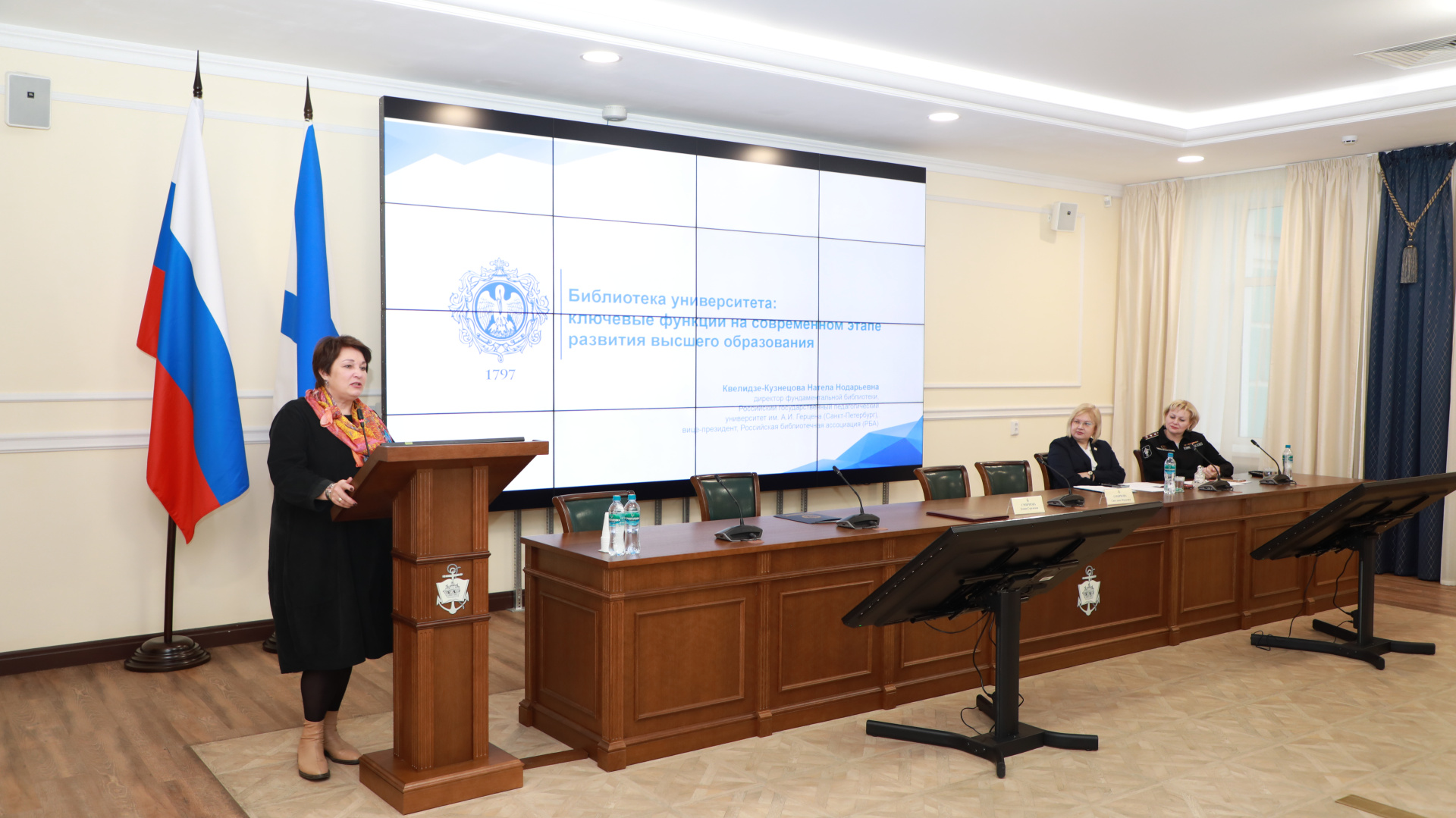 Вице-президент Российской библиотечной ассоциации, директор фундаментальной библиотеки РГПУ им. А. И. Герцена Натела Квелидзе-Кузнецова в пленарной части круглого стола отметила необходимость постоянного взаимодействия военных библиотек с большим библиотечным сообществом, интеграции библиотек военных вузов в пространство вузовских библиотек Минобрнауки, Минпросвещения России и других ведомственных подчинений. Она рассказала о ключевых функциях университетской библиотеки на современном этапе развития высшего образования. Заместитель директора фундаментальной библиотеки Светлана Морозова подробно остановилась на процессе цифровизации и интеграции ресурсов, сервисов и данных библиотек в образовательную среду. В библиотеке РГПУ им. А. И. Герцена около 100 участников круглого стола также познакомились с выставками и фильмом проекта «Читать, чтобы жить», посвященного 80-летию Победы в Великой Отечественной войне и Году защитника Отечества.