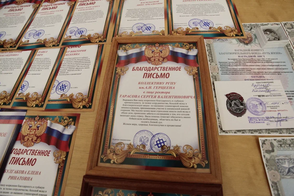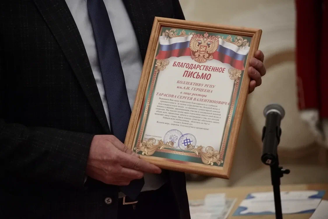 Коллектив РГПУ им. А. И. Герцена в лице ректора Сергея Тарасова получил благодарственное письмо за существенный вклад в дело победы и за поддержку гуманитарных инициатив. Герценовский университет удостоен особого статуса мецената, и представители гуманитарного конвоя «Группировка Север. Курское направление» посетили вуз для персонального награждения.