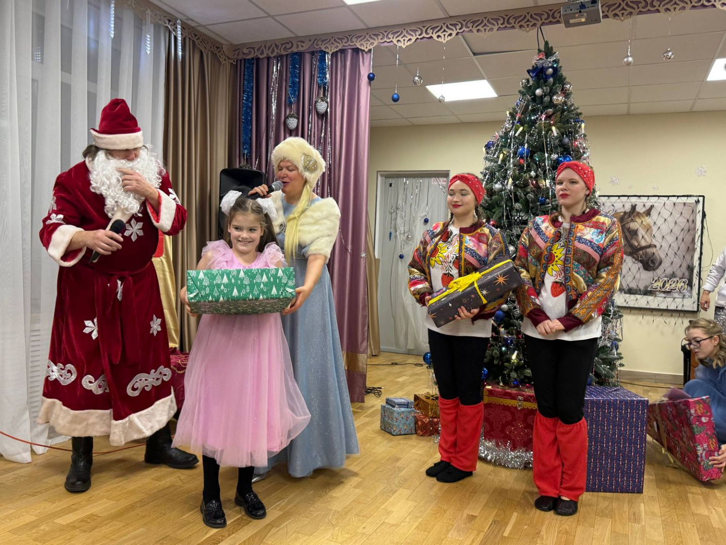 Праздничную атмосферу для детей создали ведущие мероприятия — руководитель студии «Рок-лаборатория» Студенческого дворца культуры Ольга Никиточкина и заместитель директора по воспитательной работе института физики Александр Жаркой, которые выступили в образах Снегурочки и Деда Мороза. Для ребят была подготовлена творческая программа с любимыми с детства новогодними песнями.