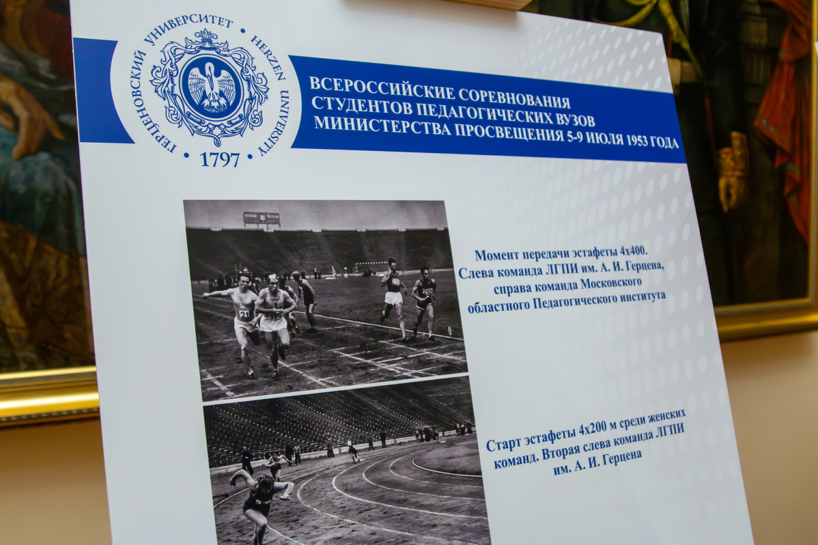 Директор института физической культуры и спорта Александр Фокин представил гостям университета фотовыставку об истории зарождения и развития физического воспитания в Герценовском университете. Его истоки восходят к середине XIX века, а профильная кафедра была сформирована в 1920-х годах. Первым заведующим кафедры физического воспитания стал Георгий Дюперрон — его портрет был также представлен широкой аудитории. Кроме того, Сергей Тарасов показал гостям портреты известных спортсменов Александра Дитятина и Галины Зыбиной, которые в преддверии юбилея пополнили галерею выдающихся деятелей Герценовского университета.