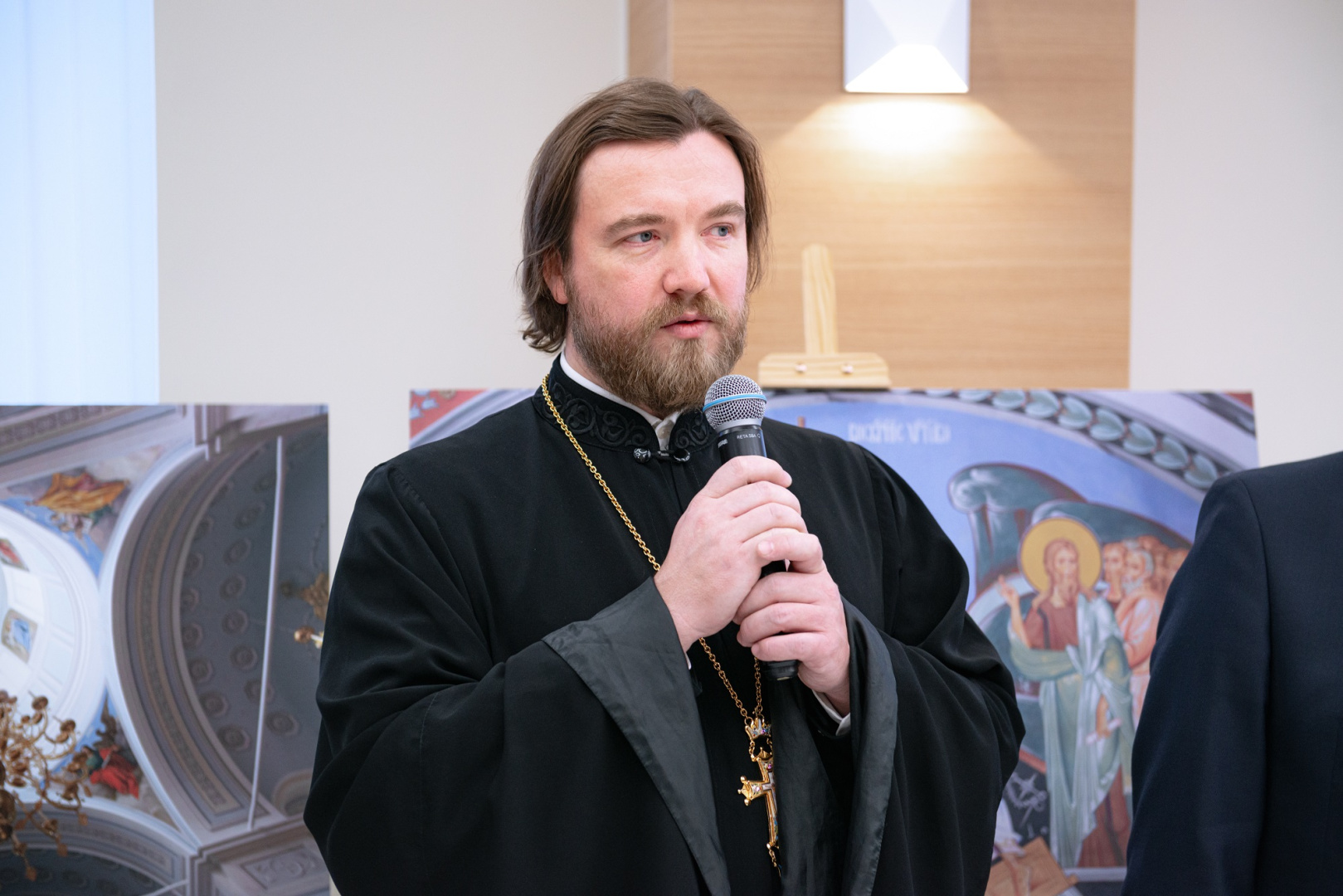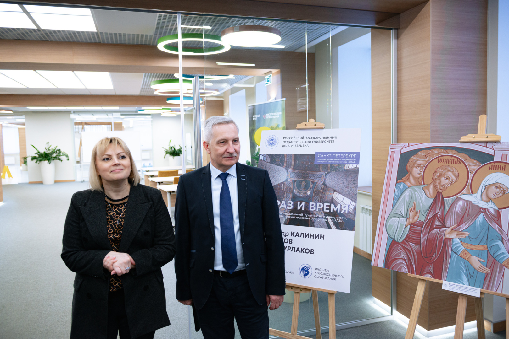 В холле Министерства просвещения Российской Федерации состоялось торжественное открытие выставки храмовой росписи «Образ и время». Здесь можно увидеть работы представителей РГПУ им. А. И. Герцена и мастерской церковного искусства «Образ» (Санкт-Петербург). В мероприятии приняла участие заместитель Министра просвещения РФ Ольга Колударова и академик Российской академии образования, ректор РГПУ им. А.И. Герцена Сергей Тарасов.